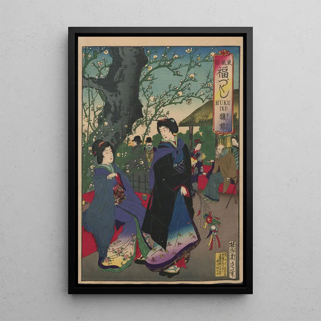 L'œuvre "L'Album de Nishikie Pl24" de Toyohara Chikanobu nous plonge dans un monde coloré et riche en détails. Cette reproduction met en avant des personnages élégants vêtus de kimonos traditionnels, évoluant dans un paysage empreint de sérénité. Les couleurs vives et les motifs délicats se mêlent harmonieusement, créant une atmosphère à la fois dynamique et apaisante. La technique de l'estampe sur papier, typique de l'époque Edo, permet de capturer la lumière et les textures avec une précision remarquable, invitant le spectateur à s'immerger dans cette scène quotidienne du Japon ancien.