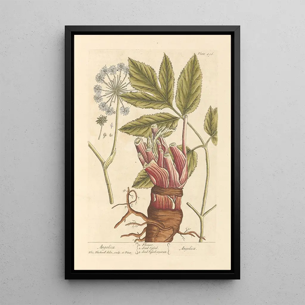 L’œuvre Angélique d’Elizabeth Blackwell est une représentation fascinante de cette plante, capturée avec une précision botanique remarquable. Les couleurs douces et naturelles, allant du vert tendre au blanc éclatant, évoquent une atmosphère paisible et sereine. La technique de l’aquarelle, associée à un trait fin et délicat, permet de mettre en valeur les détails des feuilles et des fleurs. Chaque élément semble prendre vie, invitant le spectateur à plonger dans un univers floral empreint de douceur et de légèreté. Cette reproduction d’Angélique est bien plus qu’un simple tableau ; c’est une célébration de la beauté de la nature.
