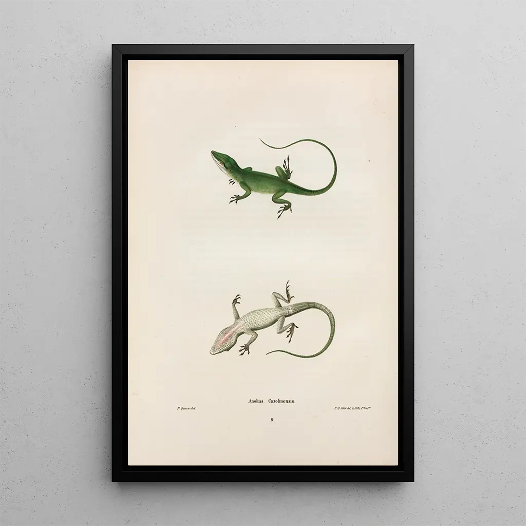 Anolis de Caroline : une danse colorée dans la nature L'Anolis de Caroline, capturé avec une précision remarquable par John Edwards Holbrook, est une œuvre qui célèbre la beauté de la faune. Dans cette reproduction, les teintes vives de vert et de brun se mêlent harmonieusement, évoquant la lumière du soleil filtrant à travers le feuillage. La technique de l'artiste, qui allie aquarelle et dessin, crée une atmosphère vivante et dynamique, presque palpable. Chaque détail, des écailles délicates aux yeux vifs de l'animal, semble inviter le spectateur à plonger dans l'univers fascinant de la biodiversité. Cette toile est une véritable ode à la nature, capturant l'essence même de cet animal emblématique. John Edwards Holbrook : un pionnier de l'illustration zoologique John Edwards Holbrook, naturaliste et illustrateur du XIXe siècle, a joué un rôle crucial dans la documentation de la faune américaine. Ses œuvres, souvent inspirées par ses explorations, reflètent une passion pour la science et l'art. Holbrook a été influencé par les découvertes de son époque, notamment celles de Charles Darwin, et a cherché à combiner l'exactitude scientifique avec une esthétique captivante. Son travail sur les reptiles et les amphibiens a non seulement enrichi la connaissance de ces espèces, mais a également établi un standard pour l'illustration zoologique. L'Anolis de Caroline est l'un de ses nombreux chefs-d'œuvre qui témoignent de son engagement envers la nature. Une acquisition décorative aux multiples atouts La reproduction de l'Anolis de Caroline est une pièce décorative qui s'intègre parfaitement dans divers espaces, que ce soit dans un salon, un bureau ou une chambre. Sa qualité d'impression et sa fidélité aux couleurs originales en font un choix idéal pour les amateurs de nature et d'art. En ajoutant cette toile à votre décoration, vous apportez une touche d'élégance et d'originalité, tout en célébrant la beauté de la faune. L'attrait esthétique de cette œuvre ne manquera pas d'éveiller la curiosité et d'engendrer des conversations, faisant de cette reproduction un atout incontournable pour tout intérieur.