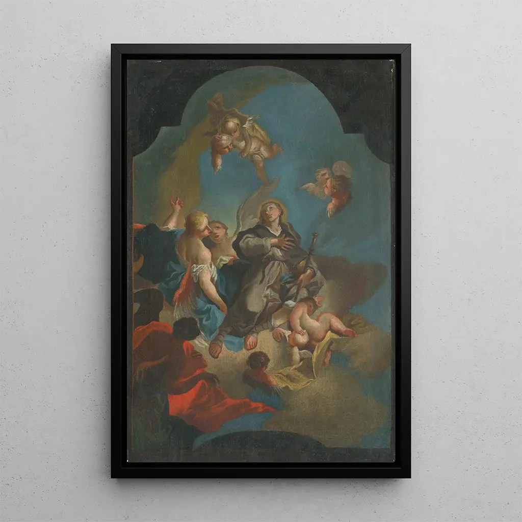 Apothéose de Saint Jacques : un éclat divin de lumière et de couleur L'Apothéose de Saint Jacques est une œuvre vibrante qui capte l'essence même de la spiritualité à travers une explosion de couleurs et de lumière. Le tableau dépeint Saint Jacques, entouré d'une atmosphère céleste, où les nuances dorées et les bleus profonds se mêlent pour créer une scène à la fois majestueuse et sereine. La technique de Palko, marquée par des coups de pinceau délicats, donne vie aux figures et aux détails, invitant le spectateur à plonger dans cette vision transcendante. Chaque élément, des drapés aux expressions des personnages, contribue à une composition harmonieuse qui évoque un sentiment de paix et de révérence. Franz Anton Palko : un maître du baroque et de la lumière Franz Anton Palko, actif au XVIIIe siècle, est reconnu pour ses contributions au mouvement baroque, où il a su allier tradition et innovation. Influencé par les grands maîtres de son temps, Palko a développé un style distinctif qui se caractérise par une utilisation audacieuse de la lumière et des ombres. Son œuvre, souvent centrée sur des thèmes religieux, reflète l'importance de la spiritualité dans la société de l'époque. L'Apothéose de Saint Jacques, en particulier, illustre son talent à capturer l'émotion et la grandeur des récits bibliques, tout en s'inscrivant dans un contexte artistique riche et dynamique. Une acquisition décorative aux multiples atouts Opter pour une reproduction de l'Apothéose de Saint Jacques, c'est choisir une toile qui enrichira votre intérieur par sa beauté et son message spirituel. Ce tableau s'intègre parfaitement dans un salon, un bureau ou une chambre, apportant une touche d'élégance et de sérénité. La qualité de la reproduction garantit une fidélité aux détails originaux, permettant de profiter de l'attrait esthétique de l'œuvre sans compromis. En ajoutant cette pièce à votre décoration, vous créez un espace inspirant où la contemplation et la paix intérieure sont à l'honneur.