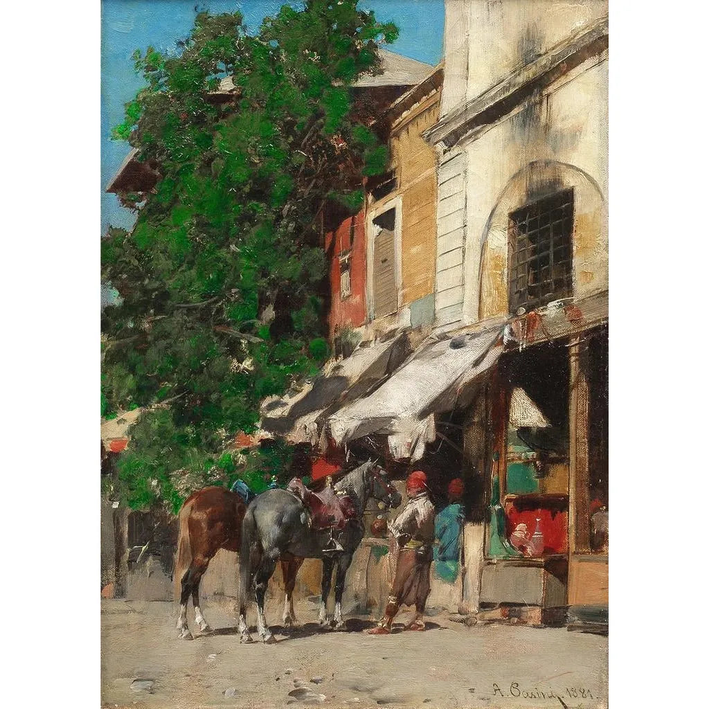 Alberto Pasini, peintre italien du XIXe siècle, est reconnu pour ses œuvres qui célèbrent l'Orient et ses paysages exotiques. Influencé par ses voyages à travers l'Empire ottoman, il a su retranscrire la beauté et la diversité de ces cultures à travers son art. Sa période de création s'étend principalement entre les années 1850 et 1880, où il a développé un style unique mêlant réalisme et romantisme. Pasini a également été un membre actif du mouvement orientaliste, qui cherchait à représenter les pays de l'Est à travers une lentille européenne. Ses œuvres, dont Au marché d'Istanbul, témoignent de son habileté à capturer des moments de vie quotidienne tout en rendant hommage à la richesse culturelle de ces régions.