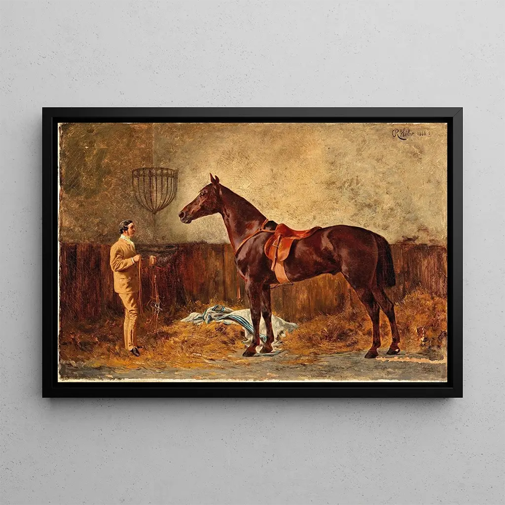 Avant la sortie à cheval : un moment de sérénité équestre L'œuvre "Avant la sortie à cheval" de Carl Rudolf Huber capture un instant de calme et de préparation avant une aventure équestre. La composition met en avant un cheval majestueux, dont la robe brune se détache sur un fond de verdure luxuriante. Les couleurs chaudes et terreuses évoquent une atmosphère paisible, tandis que la technique de peinture à l'huile confère une texture riche et vivante à chaque détail. Les rayons du soleil filtrent à travers les arbres, créant un jeu d'ombres et de lumières qui accentue la beauté naturelle de la scène. Ce tableau invite à une contemplation douce, où l'on ressent presque le souffle du cheval et le parfum de la nature environnante. Carl Rudolf Huber : un maître du réalisme animalier Carl Rudolf Huber, actif au XIXe siècle, est reconnu pour ses représentations réalistes d'animaux, en particulier les chevaux. Influencé par le mouvement romantique, Huber a su capturer l'essence et la beauté des créatures qu'il peignait, en mettant l'accent sur leur caractère et leur environnement. Sa carrière s'est épanouie dans un contexte où l'art animalier prenait de l'importance, reflétant une fascination croissante pour la nature et les animaux dans la culture européenne. Huber a su se démarquer par sa capacité à transmettre des émotions à travers ses œuvres, faisant de lui un artiste respecté dans son domaine. Une acquisition décorative aux multiples atouts La reproduction "Avant la sortie à cheval" est une pièce décorative qui saura enrichir votre intérieur, que ce soit dans un salon, un bureau ou une chambre. Sa qualité d'impression garantit une fidélité remarquable aux couleurs et aux détails de l'œuvre originale, permettant ainsi d'apporter une touche d'élégance et de sérénité à votre espace. L'attrait esthétique de ce tableau en fait un choix idéal pour les amateurs d'art animalier et de nature, tout en offrant une atmosphère chaleureuse et accueillante. En choisissant cette toile, vous optez pour une décoration qui allie beauté et histoire, tout en suscitant l'admiration de vos invités.
