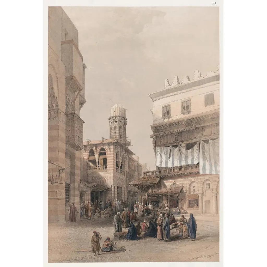 Le tableau "Bazar des chaudronniers Le Caire" de David Roberts nous transporte dans l'effervescence d'un marché égyptien du XIXe siècle. Les couleurs chaudes et terreuses, mêlées aux éclats dorés des objets en métal, créent une atmosphère vibrante et animée. La composition, riche en détails, nous invite à explorer chaque recoin de ce bazar, où artisans et clients se croisent dans une danse quotidienne. Roberts, avec sa technique de peinture à l'huile, parvient à capturer la lumière et l'ombre, donnant vie à cette scène typique du Caire, où l'artisanat et le commerce se rencontrent dans une harmonie délicate.