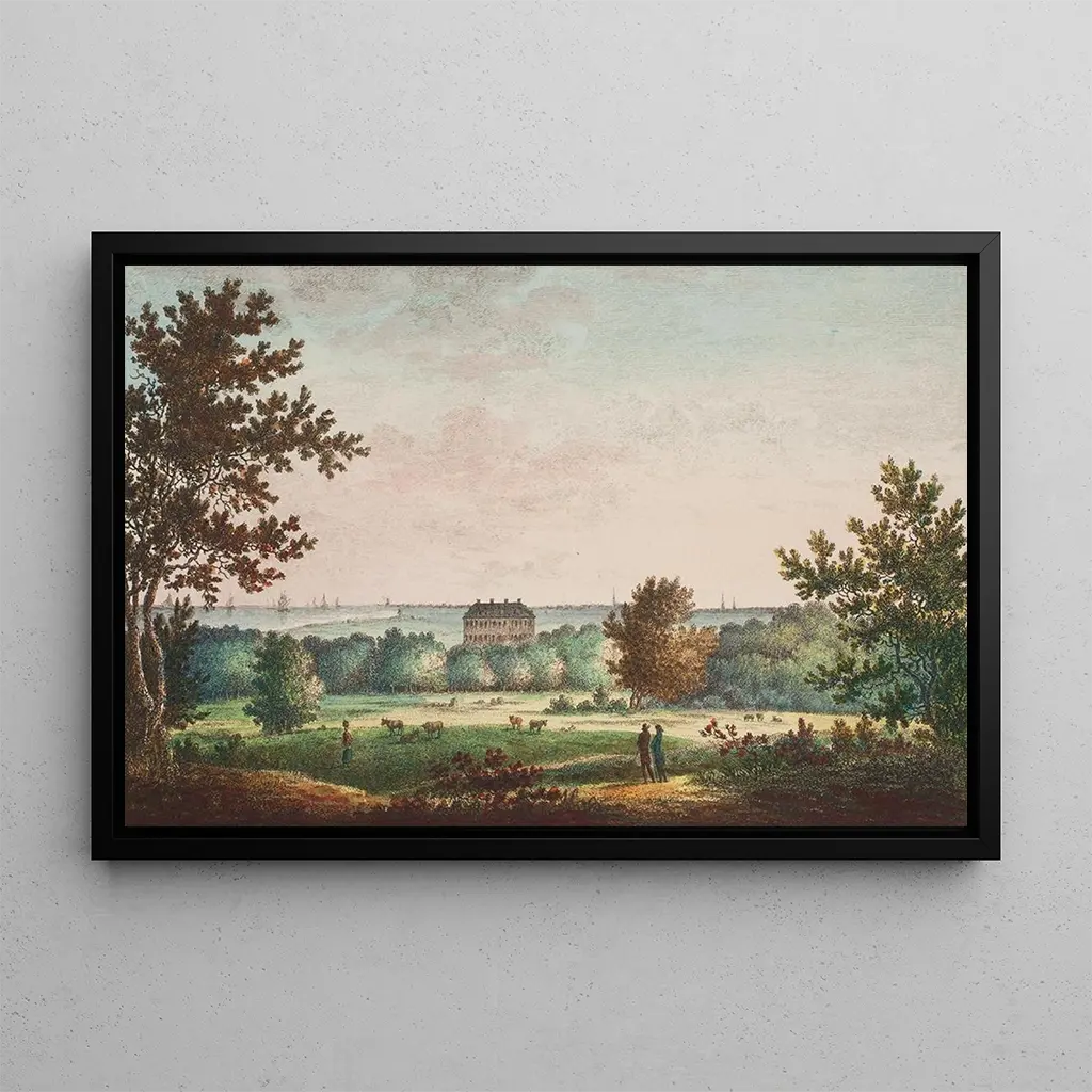 La reproduction de l'œuvre d'Elias Meyer, "Bernstorff depuis Fortunen", nous transporte dans un paysage idyllique, où la nature et l'architecture se rencontrent harmonieusement. Les teintes douces de vert et de bleu, associées à des touches de lumière dorée, créent une atmosphère sereine et apaisante. Meyer, avec son style délicat, parvient à capturer la beauté des jardins et des bâtiments, tout en transmettant une sensation de tranquillité. Cette toile évoque un moment de contemplation, où l'on peut presque entendre le murmure du vent dans les arbres et le chant des oiseaux.