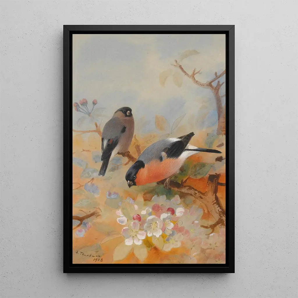 Dans cette reproduction de Bouvreuils, Archibald Thorburn capture la beauté éphémère de ces oiseaux colorés, perchés sur des branches enneigées. Les teintes vives des plumages contrastent avec le blanc pur de la neige, créant une atmosphère à la fois paisible et vivante. La technique de l’aquarelle, avec ses nuances délicates, permet de rendre la légèreté des bouvreuils tout en évoquant la froideur de l’hiver. Chaque détail, des plumes aux ombres, est soigneusement travaillé, invitant le spectateur à plonger dans cette scène hivernale empreinte de sérénité.
