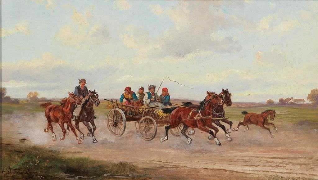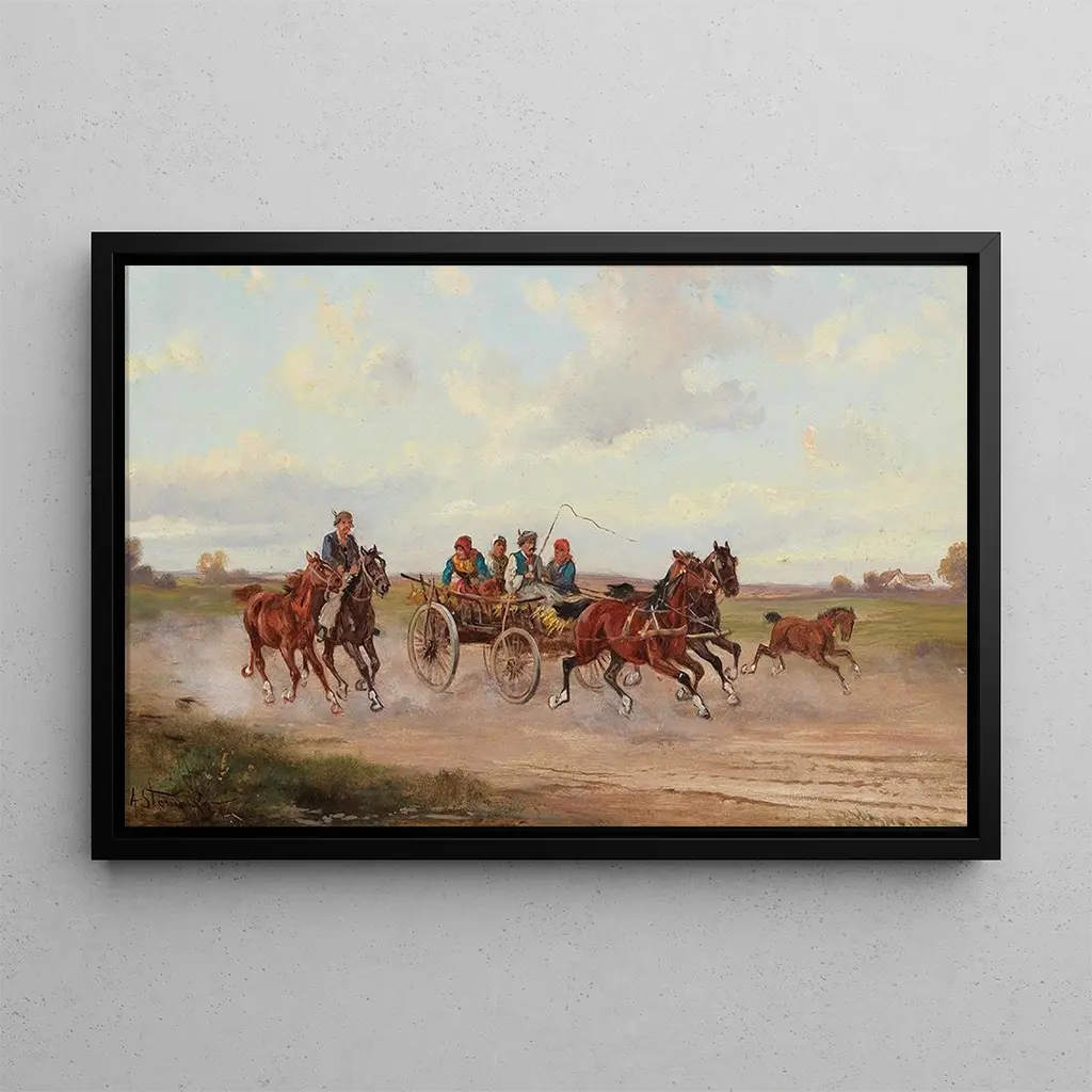 Chariot de marché hongrois : une scène de vie vibrante et colorée Le tableau "Chariot de marché hongrois" d'Alfred Steinacker dépeint une scène animée où la vie rurale s'épanouit sous un ciel lumineux. Les couleurs vives, allant des rouges éclatants aux verts luxuriants, créent une atmosphère joyeuse et dynamique. La technique de Steinacker, caractérisée par des coups de pinceau expressifs, donne vie aux personnages et aux objets, rendant presque palpable l'effervescence du marché. Chaque détail, du chariot chargé de produits frais aux visages souriants des vendeurs, invite le spectateur à plonger dans cette représentation authentique de la culture hongroise. Alfred Steinacker : un témoin de la vie rurale au tournant du XXe siècle Né en 1858, Alfred Steinacker est un peintre hongrois qui a su capturer l'essence de la vie quotidienne de son époque. Influencé par le mouvement impressionniste, il a développé un style unique qui allie réalisme et touches de couleur vibrantes. Actif principalement à la fin du XIXe et au début du XXe siècle, il a su immortaliser les traditions et les paysages de la Hongrie à travers ses œuvres. Son travail est souvent considéré comme un témoignage précieux de la culture et des modes de vie de son pays, faisant de lui une figure importante de l'art hongrois. Une acquisition décorative aux multiples atouts La reproduction du "Chariot de marché hongrois" est un choix idéal pour embellir votre intérieur, que ce soit dans un salon, un bureau ou une chambre. Sa qualité d'impression garantit une fidélité aux couleurs et aux détails du tableau original, apportant une touche d'authenticité à votre décoration. Avec son attrait esthétique indéniable, cette toile attire le regard et suscite la curiosité, tout en évoquant une atmosphère chaleureuse et accueillante. Offrez-vous cette œuvre pour enrichir votre espace de vie avec une touche d'histoire et de culture.
