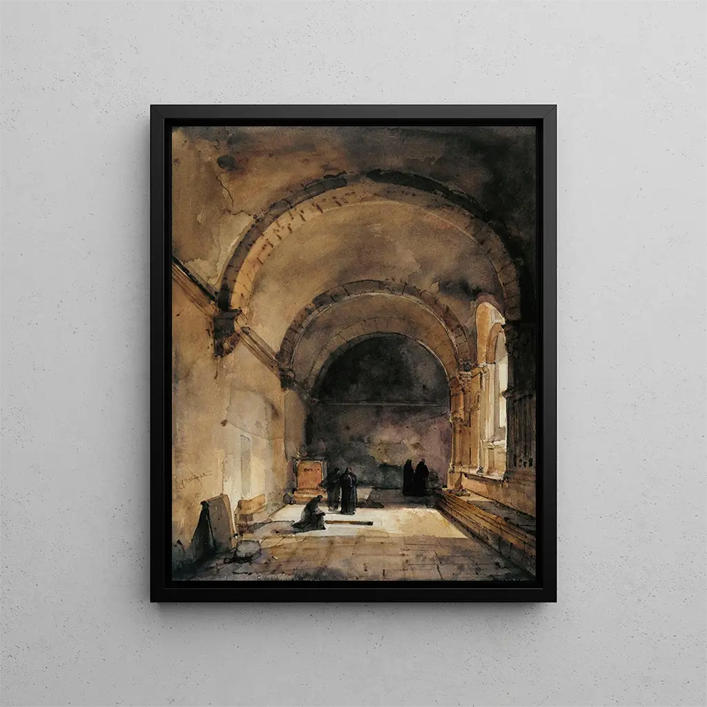 La toile "Cinq personnages sous une voûte" de François-Marius Granet est une œuvre qui transporte le spectateur dans un univers à la fois intime et mystérieux. Dans cette scène, l’artiste nous invite à contempler une réunion de figures humaines, capturées sous une voûte architecturale qui semble à la fois protectrice et révélatrice. L’atmosphère qui émane de cette œuvre est empreinte de sérénité, mais également d’une certaine mélancolie, comme si ces personnages étaient figés dans un moment de réflexion profonde. La lumière douce qui éclaire leurs visages et les ombres délicates qui se dessinent sur les murs ajoutent une dimension presque spirituelle à cette composition, invitant à une analyse plus poussée de leurs interactions et de leur environnement.