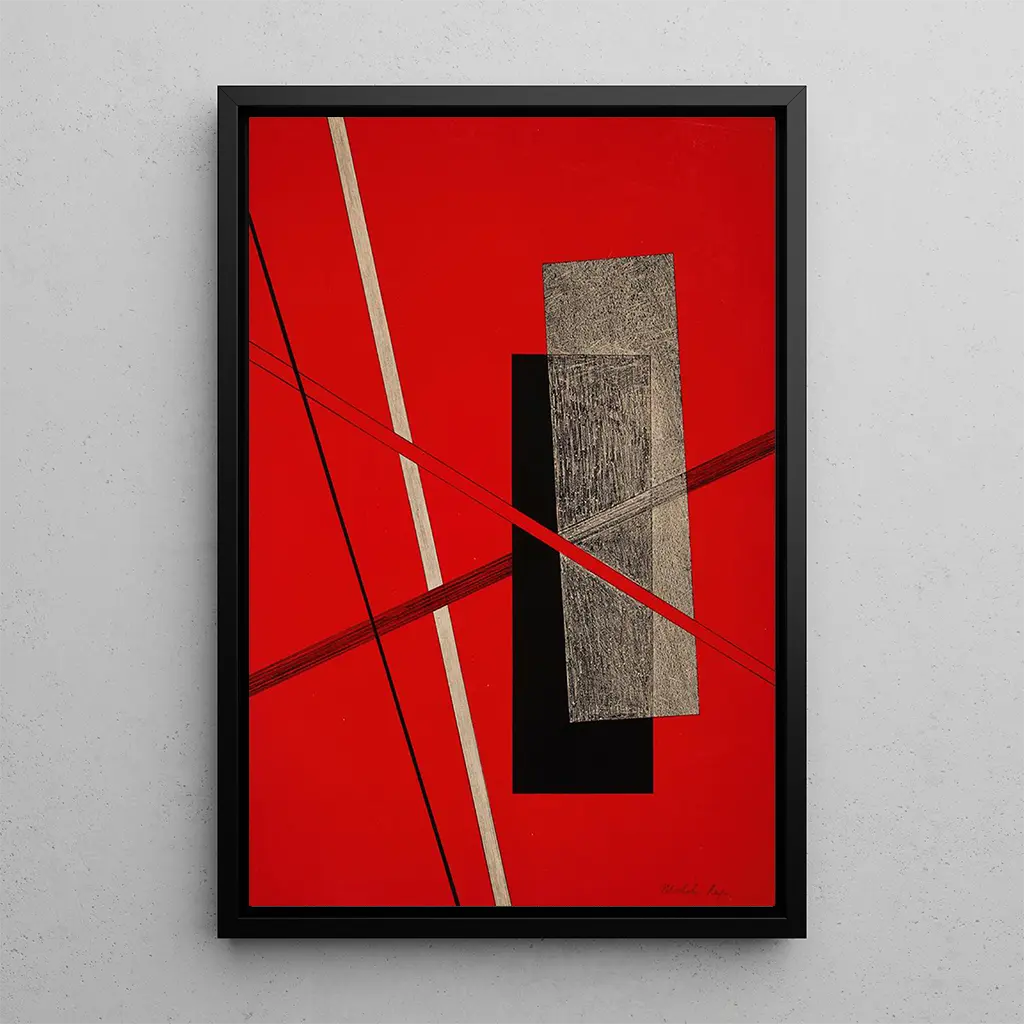 La reproduction de Construction IV de László Moholy-Nagy nous plonge dans un univers où les formes géométriques se rencontrent et s'entrelacent avec une fluidité remarquable. Les couleurs vives et contrastées créent une atmosphère vibrante, presque cinétique, qui attire immédiatement l'œil. Chaque élément de cette œuvre semble être en dialogue avec les autres, formant un ensemble cohérent et harmonieux. La technique mixte utilisée par Moholy-Nagy, alliant peinture et collage, confère à cette toile une profondeur et une texture qui enrichissent l'expérience visuelle. Ce tableau est une véritable invitation à la réflexion sur l'interaction entre l'art et l'espace.