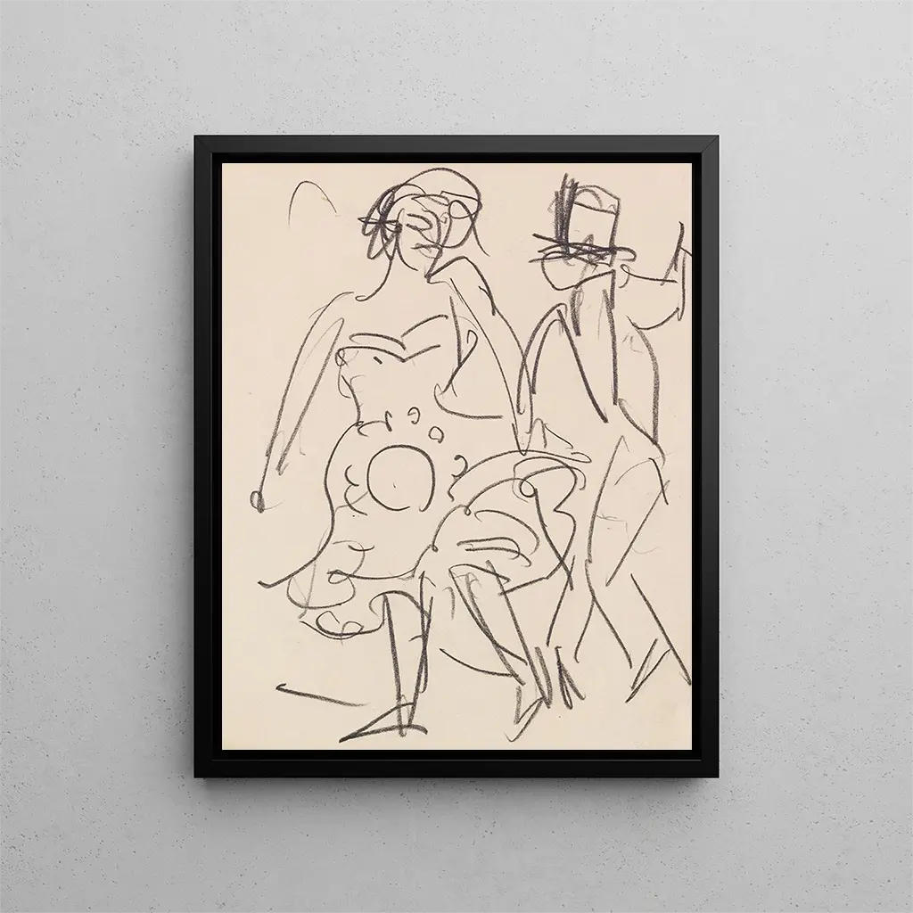 Ernst Ludwig Kirchner, né en 1880 à Dresde, est l'un des fondateurs du mouvement expressionniste en Allemagne. Son parcours artistique est marqué par une quête incessante de la modernité et une volonté de représenter la vie urbaine de son époque. Kirchner, à travers ses œuvres, explore les thèmes de l'isolement, de l'angoisse existentielle et de la recherche de l'authenticité dans un monde en pleine mutation. "Couple dansant" illustre parfaitement cette dualité : la joie de vivre se heurte à une réalité souvent sombre. L'influence de Kir
