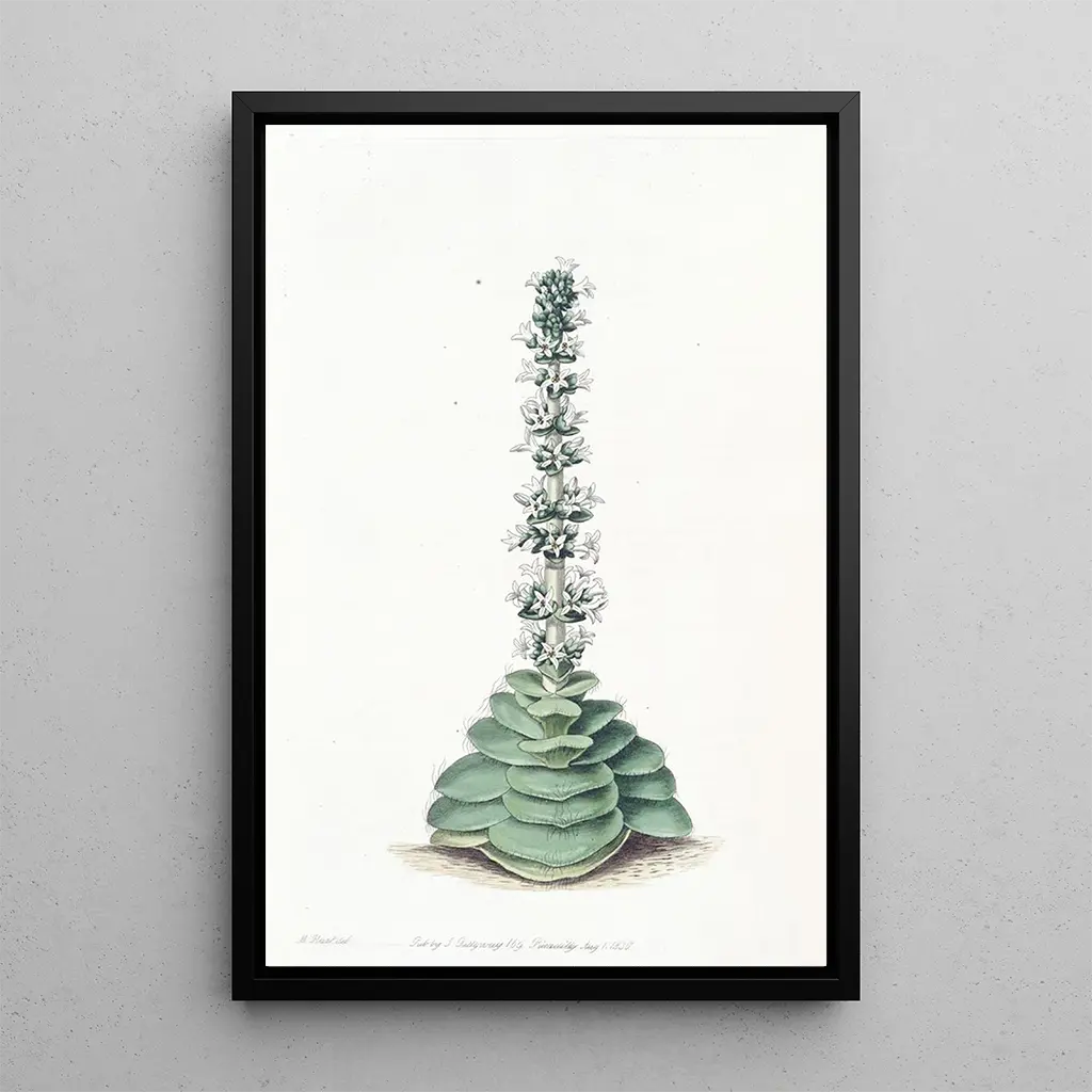 Sydenham Edwards, actif au début du XIXe siècle, est reconnu pour son rôle essentiel dans l’illustration botanique. Influencé par les découvertes scientifiques de son époque, il a su allier précision et esthétique dans ses œuvres. Edwards a collaboré avec des botanistes renommés, contribuant à la documentation de nombreuses espèces végétales. Son style distinctif, caractérisé par une attention minutieuse aux détails et une palette de couleurs vibrantes, a marqué son époque et continue d’inspirer les artistes contemporains. La Crassula à tourelles est un exemple parfait de son talent, reflétant l’importance de la botanique dans l’art et la science.