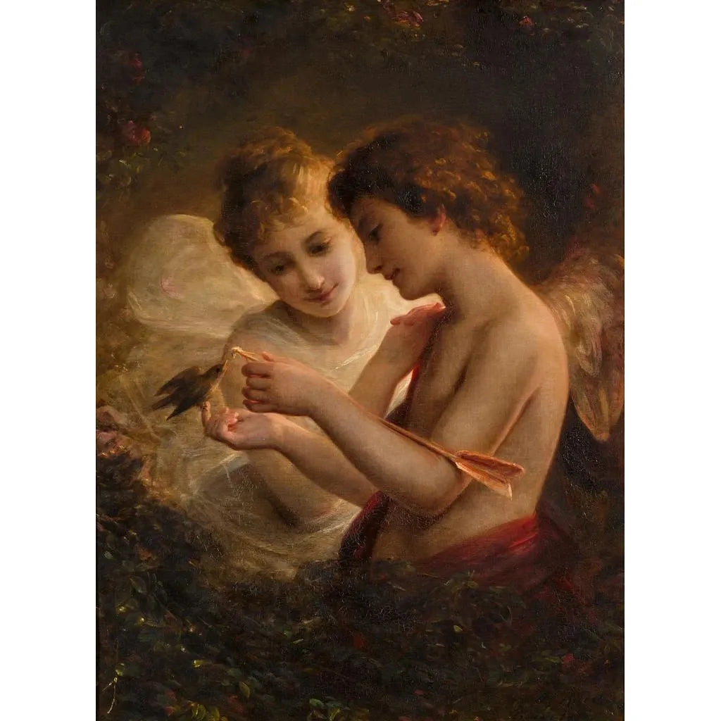Dans la reproduction de "Cupidon et Psyché", August Riedel capture une scène mythologique empreinte de tendresse et de passion. Les couleurs douces et les nuances délicates de la toile évoquent une atmosphère rêveuse, où les figures de Cupidon et Psyché se rejoignent dans une étreinte pleine de promesses. La technique de Riedel, mêlant habilement le clair-obscur et les détails minutieux, donne vie à cette rencontre divine, créant un dialogue visuel entre les personnages. Chaque coup de pinceau semble raconter une histoire, invitant le spectateur à plonger dans l'intimité de ce moment suspendu.