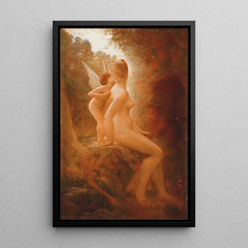 La reproduction de "Cupidon et Psyché" par Charles Auguste Sellier nous transporte dans un univers de passion et de mystère. Cette œuvre emblématique illustre la rencontre entre l'amour et l'âme, représentée par Cupidon et Psyché. Les couleurs douces et les détails raffinés de cette toile évoquent une atmosphère romantique, où chaque élément semble raconter une histoire d'amour éternelle. La composition, avec ses courbes délicates et ses expressions émouvantes, invite à la contemplation, permettant au spectateur de s'immerger dans cette légende mythologique.