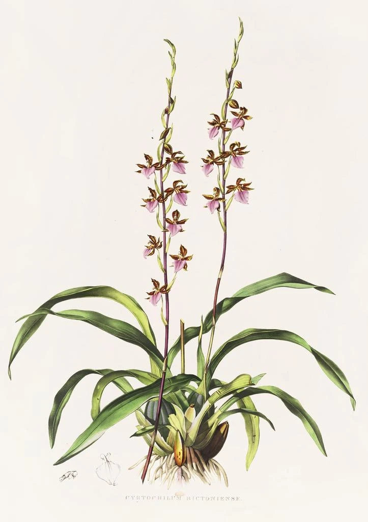 La reproduction de Cyrtochilum Bictoniense est une véritable célébration de la flore tropicale. Cette œuvre vibrante met en avant des fleurs aux teintes éclatantes, allant du rouge intense au jaune lumineux, créant un contraste saisissant. La technique de l’artiste, qui combine aquarelle et détails précis, donne vie à cette composition florale, transportant le spectateur dans un jardin luxuriant. L’atmosphère qui se dégage de ce tableau est à la fois joyeuse et apaisante, évoquant la richesse de la biodiversité et la beauté des paysages exotiques. Chaque élément de cette œuvre semble raconter une histoire, invitant à l’émerveillement.