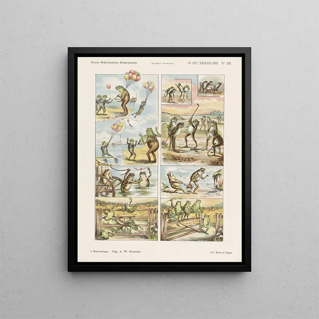 Emrik Binger, artiste néerlandais actif au 20ème siècle, est connu pour ses œuvres qui capturent la vie naturelle d'une manière à la fois poétique et réaliste. 'Dans le pays des grenouilles' est une pièce emblématique qui illustre son intérêt pour la faune. Le tableau évoque des scènes de marais, où les grenouilles et autres créatures aquatiques évoluent dans un cadre verdoyant. Le style de Binger se caractérise par des couleurs vives et une attention minutieuse aux détails, ce qui permet au spectateur de ressentir une connexion immédiate avec la nature. Ce tableau, comme beaucoup d'autres de l'artiste, est non seulement une représentation artistique, mais aussi une invitation à la contemplation de notre environnement naturel. Dans le contexte contemporain, cette œuvre revêt un intérêt particulier, car elle nous rappelle l'importance de la biodiversité et de la préservation des habitats naturels. L'œuvre de Binger trouve ainsi écho dans les préoccupations actuelles pour l'écologie et la durabilité. Pour apprécier pleinement la beauté de cette pièce, nous vous invitons à découvrir sa reproduction sur Artem Legrand.