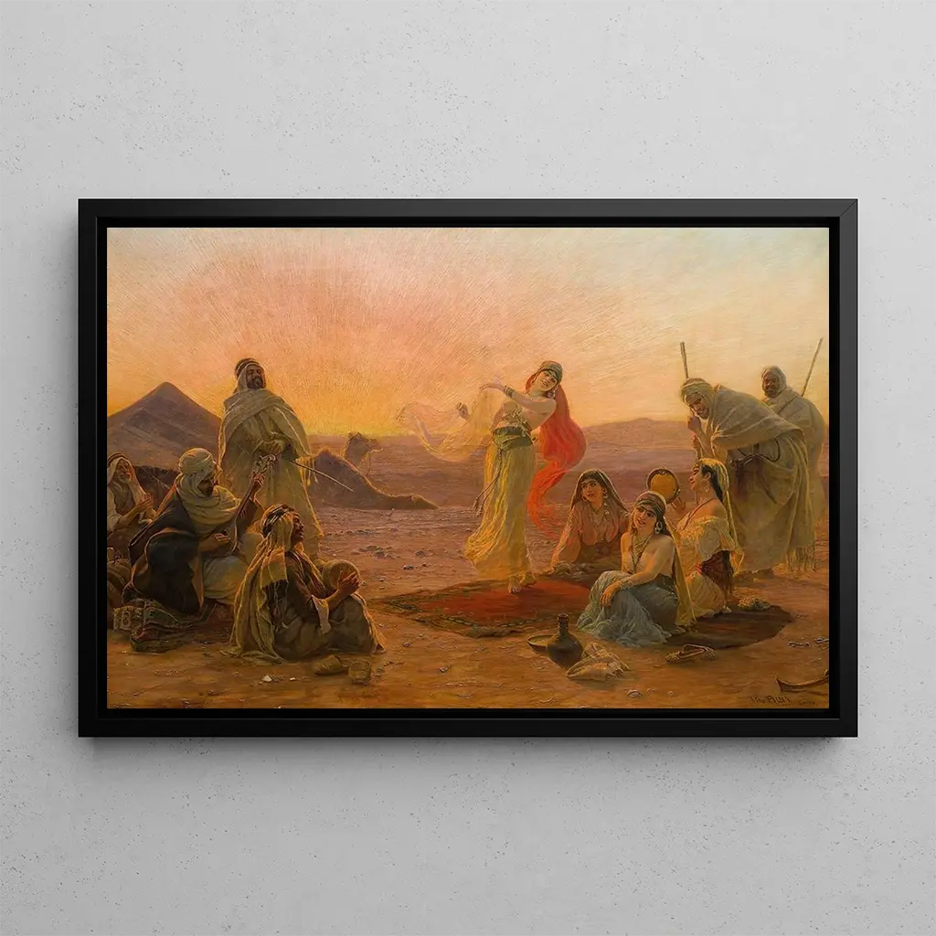 "Danse au Coucher du Soleil" est une œuvre vibrante qui capture l'essence d'un moment fugace, où la lumière dorée du soleil couchant enveloppe les danseurs dans une atmosphère chaleureuse et festive. Les couleurs éclatantes, allant des oranges profonds aux violets délicats, créent un contraste saisissant qui attire immédiatement le regard. La technique de l'huile sur toile permet à Otto Pilny de jouer avec les ombres et les lumières, donnant vie aux mouvements gracieux des figures en pleine danse. Cette scène évoque une joie de vivre et une célébration de la beauté du moment présent.