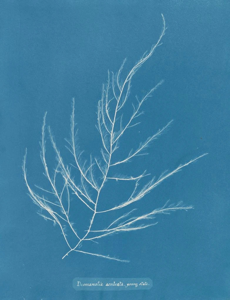 Reproduction Desmarestia aculeata jeune état - Anna Atkins – Introduction captivante La reproduction Desmarestia aculeata jeune état - Anna Atkins est bien plus qu’une simple image. Elle incarne une époque où l'art et la science se rejoignent, révélant la beauté cachée du monde naturel. Anna Atkins, pionnière de la photographie botanique, a su capter l'essence même des algues à travers son œuvre. Dans cette pièce, elle immortalise une espèce d'algue marine, le Desmarestia aculeata, d'une manière qui transcende le simple enregistrement visuel. En explorant cette œuvre, nous plongeons dans un univers où la nature est à la fois sujet d'étude et source d'inspiration, invitant le spectateur à contempler la délicatesse et la complexité de la vie marine. Style et singularité de l’œuvre Le style de cette œuvre se distingue par son approche novatrice de la représentation botanique. Anna Atkins utilise la technique du cyanotype, une méthode photographique qui produit des impressions d'un bleu profond et vivant. Les formes délicates des algues, présentées avec une précision minutieuse, semblent presque flotter sur le papier, créant une sensation de légèreté et de transparence. Cette technique, bien qu'expérimentale pour l'époque, permet à Atkins de capturer non seulement la structure des algues, mais aussi leur essence. La composition, à la fois simple et élégante, met en avant la beauté intrinsèque de la nature, tout en invitant à une réflexion sur notre relation avec le monde naturel. Chaque détail, chaque nuance de bleu, évoque une poésie visuelle qui transporte le spectateur dans un voyage sensoriel. L’artiste et son influence Anna Atkins, souvent considérée comme la première femme photographe, a joué un rôle crucial dans l’histoire de la photographie et de la botanique. Son œuvre, qui allie art et science, a ouvert la voie à de nombreux artistes et scientifiques. En utilisant la photographie pour documenter les spécimens botaniques, elle a non seulement contribué à la connaissance scientifique de son temps, mais a également redéfini les frontières de l’art. Son influence se fait sentir dans le travail de nombreux artistes contemporains qui explorent les thèmes de la nature et de la représentation visuelle. Atkins a su démontrer que la photographie pouvait être un moyen d’expression artistique à part entière, tout en servant un but éducatif. Sa vision unique continue d'inspir