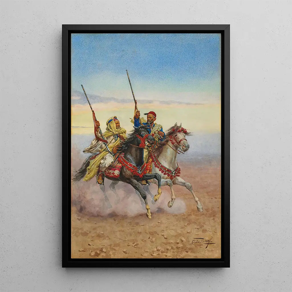 Giulio Rosati, peintre italien du XIXe siècle, est reconnu pour son talent à capturer des scènes de la vie orientale avec une précision et une sensibilité uniques. Influencé par ses voyages en Afrique du Nord et au Moyen-Orient, Rosati a su intégrer des éléments de ces cultures dans ses œuvres, faisant de lui une figure emblématique du mouvement orientaliste. Son style, marqué par un souci du détail et une utilisation habile de la lumière, lui a permis de se démarquer parmi ses contemporains. "Deux cavaliers" témoigne de son habileté à représenter non seulement des personnages, mais aussi l'âme de la culture qu'il dépeint, faisant de chaque tableau une fenêtre sur un monde fascinant.