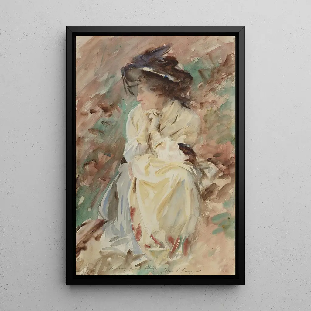 La reproduction d'Eliza, réalisée par John Singer Sargent, évoque une douceur et une finesse qui captivent instantanément le regard. Le tableau met en avant une jeune femme à l'allure délicate, vêtue d'une robe élégante qui semble flotter autour d'elle. Les couleurs pastel et la lumière subtilement diffusée créent une atmosphère rêveuse, tandis que les détails minutieux du visage et des mains de la modèle témoignent du talent exceptionnel de Sargent. Chaque coup de pinceau semble imprégné d'une émotion palpable, invitant le spectateur à s'immerger dans l'univers intime de cette figure féminine.
