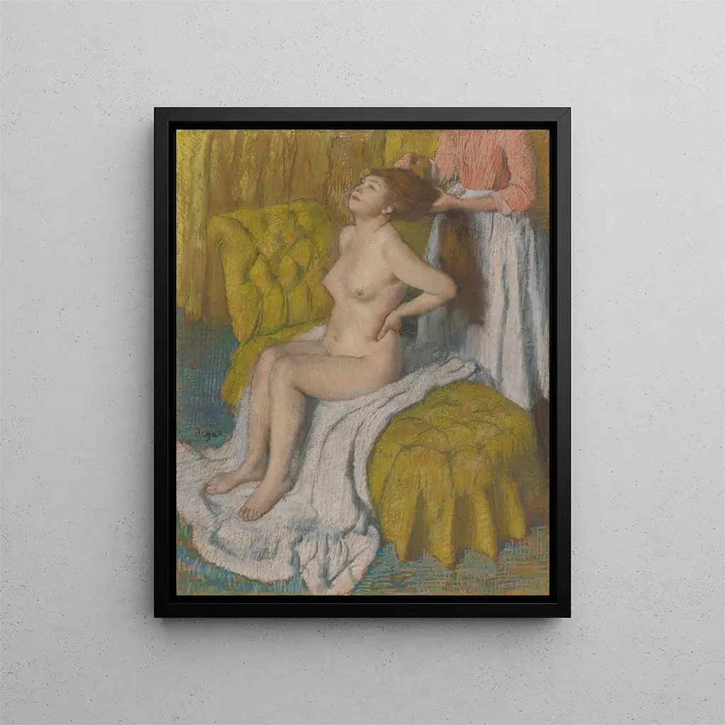 Reproduction Femme se faisant peigner les cheveux - Edgar Degas – Introduction captivante Dans l'univers fascinant de l'art, certaines œuvres parviennent à transcender le temps et à capturer l'essence même de la vie quotidienne. "Femme se faisant peigner les cheveux" d'Edgar Degas est l'une de ces pièces emblématiques. Réalisée à la fin du XIXe siècle, cette œuvre évoque une intimité délicate et un moment fugace de la vie d'une femme. Le tableau, par son sujet simple mais évocateur, nous invite à contempler non seulement le geste de se coiffer, mais aussi la beauté de la féminité et la poésie des gestes quotidiens. Dans cette scène intimiste, Degas nous transporte dans un univers où le temps semble suspendu, nous offrant un aperçu d'une réalité à la fois banale et sublime. Style et singularité de l’œuvre La singularité de "Femme se faisant peigner les cheveux" réside dans la maîtrise technique et l'originalité du traitement des formes. Degas, reconnu pour son approche novatrice, joue avec la lumière et l'ombre pour créer une atmosphère intimiste. La composition, centrée sur la figure féminine, est caractérisée par des lignes douces et des couleurs délicates qui évoquent la sérénité. Le choix du sujet, une femme absorbée dans un moment de soin personnel, témoigne de l'intérêt de l'artiste pour la vie quotidienne et les scènes de genre. La posture de la femme, légèrement courbée, et l'attention portée à ses cheveux, soulignent la grâce et la vulnérabilité de son personnage. En outre, Degas utilise des angles de vue audacieux, souvent inspirés de la photographie, pour apporter une dimension dynamique à l'œuvre, rompant ainsi avec les conventions académiques de son époque. L’artiste et son influence Edgar Degas, figure emblématique du mouvement impressionniste, a su marquer son époque par son regard unique sur la société et la vie urbaine. Né à Paris en 1834, il a été influencé par les mouvements artistiques de son temps, tout en développant un style personnel qui lui est propre. Sa passion pour le ballet et les scènes de la vie parisienne l'a conduit à explorer des thèmes variés, allant des danseuses aux femmes dans leur intimité. Degas est souvent considéré comme un précurseur de la modernité, ayant su capturer