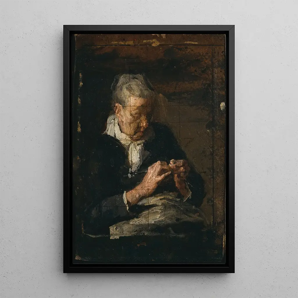 Dans cette œuvre délicate, Thomas Eakins nous présente une femme absorbée dans l’acte de tricoter, un moment de calme et de concentration. La composition met en avant la douceur des lignes et des formes, tandis que les couleurs chaudes créent une atmosphère accueillante. La lumière naturelle qui éclaire la scène accentue les détails du tricot et du visage, révélant une profondeur émotionnelle. Ce tableau, à la fois intime et universel, évoque la beauté des gestes quotidiens et la tranquillité d’un instant suspendu dans le temps.