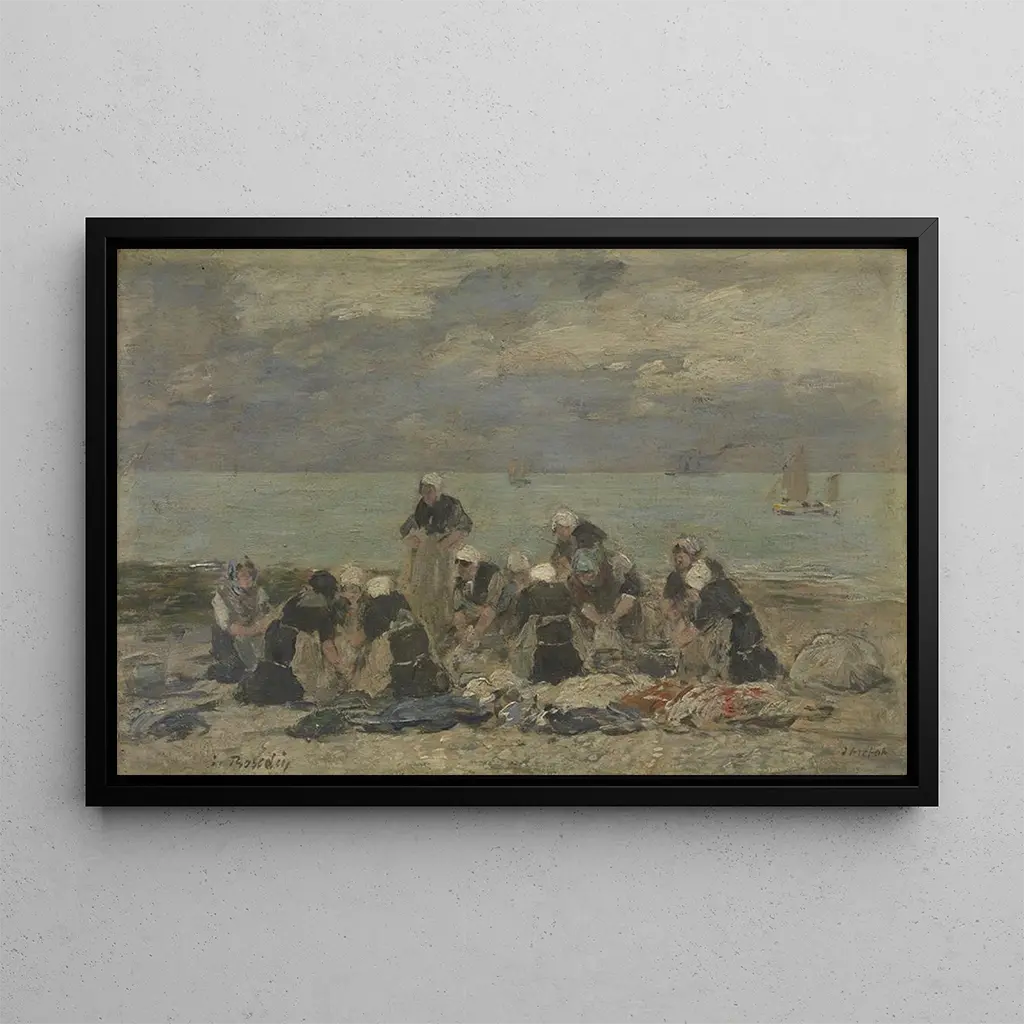Dans Femmes lavant le linge à Étretat, Eugène Boudin capture un moment de la vie quotidienne sur la côte normande. Les figures féminines, absorbées par leur tâche, sont baignées dans une lumière douce qui souligne la beauté des paysages environnants. Les teintes pastel et les coups de pinceau délicats évoquent une atmosphère paisible, presque nostalgique. Boudin, précurseur de l'impressionnisme, parvient à transmettre une sensation de mouvement et de vie, faisant de cette œuvre une véritable ode à la simplicité et à la beauté du quotidien.