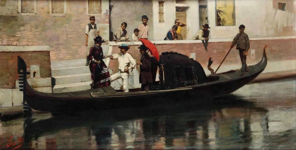 Luigi Sorio, actif au XIXe siècle, est reconnu pour ses représentations poétiques de la vie quotidienne à Venise. Influencé par les grands maîtres de la Renaissance, il a su capturer l'essence de cette ville unique à travers ses œuvres. Sorio a évolué dans un contexte artistique riche, où le romantisme et l'impressionnisme commençaient à influencer les styles traditionnels. Ses tableaux, tels que Figure sur gondole, témoignent de son habileté à marier la technique classique avec des touches de modernité, faisant de lui un artiste important de son époque, dont l'héritage perdure dans l'appréciation contemporaine de l'art vénitien.