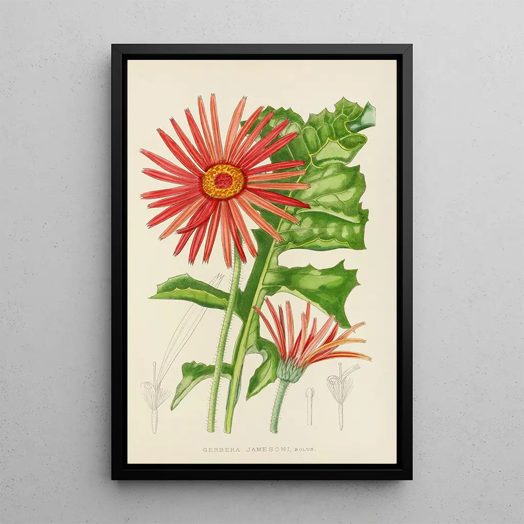 Gerbera jamesoni : une explosion de couleurs florales La reproduction de Gerbera jamesoni nous plonge dans un univers vibrant où les couleurs éclatantes se mêlent harmonieusement. Cette toile, réalisée avec une technique de peinture à l'huile, capte la lumière d'une manière qui donne vie aux pétales délicats de la fleur. Les nuances de rose, d'orange et de jaune se superposent, créant une atmosphère joyeuse et accueillante. L'artiste parvient à transmettre une sensation de fraîcheur et de légèreté, invitant le spectateur à apprécier la beauté éphémère de la nature. Chaque détail est soigneusement travaillé, des contours des pétales aux reflets de lumière, rendant cette œuvre à la fois réaliste et poétique. Illtyd Buller Pole-Evans : un pionnier de la botanique artistique Illtyd Buller Pole-Evans est un artiste botaniste du début du XXe siècle, connu pour ses illustrations précises et ses compositions florales. Ses œuvres, souvent inspirées par la nature britannique et ses voyages, témoignent d'une passion pour la botanique et d'un souci du détail. Pole-Evans a su allier art et science, rendant hommage à la beauté des plantes tout en respectant leur anatomie. Son style, influencé par le mouvement Arts and Crafts, met en avant l'harmonie entre l'art et la nature. Cette reproduction de Gerbera jamesoni s'inscrit parfaitement dans son héritage, célébrant la diversité florale avec une touche artistique unique. Une acquisition décorative aux multiples atouts Cette reproduction de Gerbera jamesoni est un choix idéal pour embellir votre intérieur, que ce soit dans un salon, un bureau ou une chambre. Sa palette de couleurs vives apporte une touche de gaieté et de dynamisme à n'importe quel espace. La qualité de l'impression garantit une fidélité aux détails de l'œuvre originale, permettant de profiter de toute la splendeur de cette fleur. En ajoutant ce tableau à votre décoration, vous créez un point focal captivant qui attire le regard et suscite l'admiration. Offrez-vous cette toile et laissez-vous séduire par la beauté florale intemporelle qu'elle incarne.