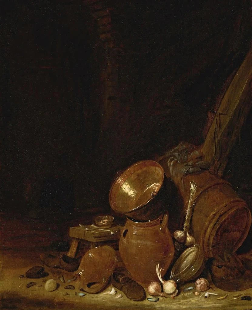 Dans "Intérieur de la cuisine", Kalf déploie un style baroque, caractérisé par un usage audacieux de la lumière et des ombres. La composition est soigneusement orchestrée, chaque élément étant disposé de manière à créer une harmonie visuelle. Les textures des matériaux, qu'il s'agisse du bois poli, de la céramique émaillée ou des tissus riches, sont rendues avec une précision remarquable. La palette de couleurs, à la fois chaude et accueillante, évoque une atmosphère de confort et de convivialité. Ce tableau ne se contente pas de représenter une scène de la vie quotidienne ; il en révèle également la richesse symbolique. Les objets, loin d'être anodins, portent en eux des significations profondes, évoquant la prospérité, la culture et le savoir-faire artisanal de l'époque. La manière dont Kalf joue avec la lumière, créant des reflets et des jeux d'ombre, confère à l'œuvre une dimension presque vivante, captivant ainsi le regard du spectateur.