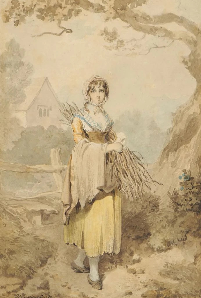 Dans cette œuvre délicate, la jeune fille ramassant du bois se dévoile dans un paysage rural, baigné par une lumière douce et chaleureuse. Les couleurs pastel, dominées par des teintes de vert et de brun, évoquent la sérénité de la nature. La technique de Francis Wheatley, mêlant aquarelle et huile, confère à la toile une atmosphère légère et aérienne. La posture gracieuse de la jeune fille, concentrée sur sa tâche, invite à une contemplation paisible, presque méditative, d’un moment simple mais chargé de poésie.