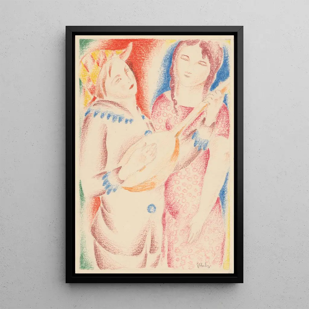 Dans Jouant de la mandoline, Mikuláš Galanda capture l'essence d'un moment musical empreint de poésie. Les couleurs vibrantes et les formes dynamiques évoquent une scène vivante où la musique semble presque palpable. La composition, centrée sur le musicien, attire le regard et crée une connexion émotionnelle avec le spectateur. Les nuances chaudes et les jeux de lumière ajoutent une dimension presque tactile à l'œuvre, rendant hommage à l'art de la performance. Galanda réussit à immortaliser l'instant fugace d'une mélodie, transformant la toile en une véritable ode à la musique.
