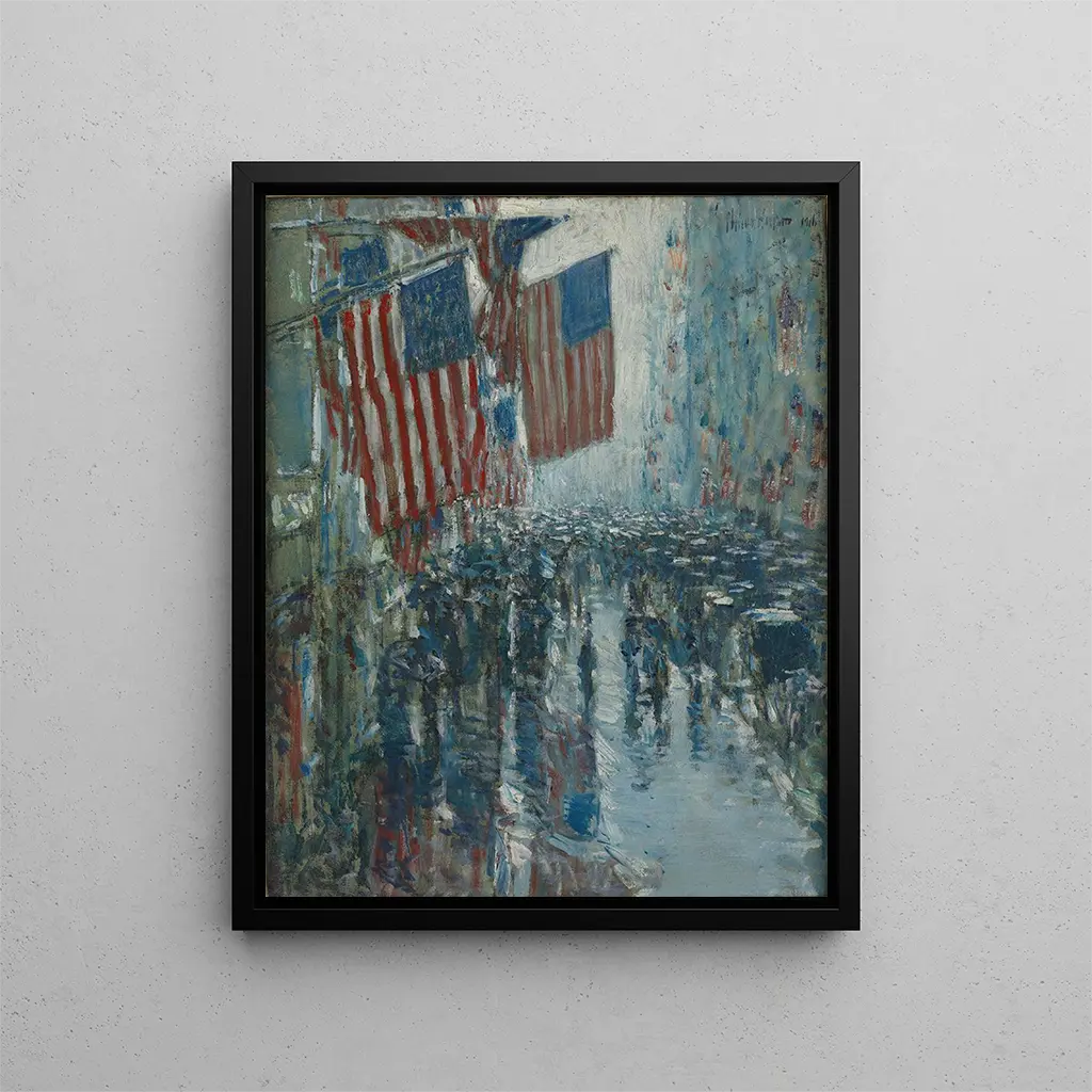 Reproduction Jour de pluie sur la Cinquième Avenue - Childe Hassam – Introduction captivante Dans l'univers foisonnant de l'art impressionniste, l'œuvre "Jour de pluie sur la Cinquième Avenue" de Childe Hassam se distingue par sa capacité à capturer l'essence d'une métropole en plein mouvement. Cette toile, réalisée en 1916, évoque une scène emblématique de New York, où la pluie, loin d'être un simple phénomène météorologique, devient le protagoniste d'une atmosphère vibrante et mélancolique. Les parapluies colorés, tels de petites fleurs éparpillées sur le bitume, transforment la grisaille en une palette de nuances éclatantes, offrant au spectateur une immersion dans la vie urbaine. La reproduction de cette œuvre permet à chacun d'apprécier la magie de ce moment fugace, tout en rendant hommage à la maîtrise de l'artiste. Style et singularité de l’œuvre Le style de Childe Hassam se caractérise par une approche lumineuse et dynamique, où la lumière joue un rôle prépondérant dans la composition. Dans "Jour de pluie sur la Cinquième Avenue", les coups de pinceau rapides et les touches de couleur juxtaposées créent une sensation de mouvement, presque palpable. L'artiste parvient à transmettre l'énergie de la ville tout en conservant une certaine douceur, grâce à l'utilisation de teintes pastel qui adoucissent l'intensité de la scène. Les reflets sur les pavés mouillés ajoutent une dimension supplémentaire à l'œuvre, rendant l'expérience visuelle encore plus immersive. Ce tableau est une ode à la beauté des instants quotidiens, où la pluie devient le révélateur de la poésie urbaine, une caractéristique essentielle de l'impressionnisme. L’artiste et son influence Childe Hassam, figure emblématique de l'impressionnisme américain, a su s'imposer sur la scène artistique du début du XXe siècle. Né en 1859 à Dorchester, près de Boston, il a été influencé par les grands maîtres européens, tout en développant un style propre qui reflète son attachement à la culture américaine. Sa passion pour la lumière et la couleur l'a conduit à explorer divers sujets, allant des paysages aux scènes de la vie urbaine. "Jour de pluie sur la Cinquième Avenue" illustre parfaitement son talent à capturer l'esprit d'une époque et d'un