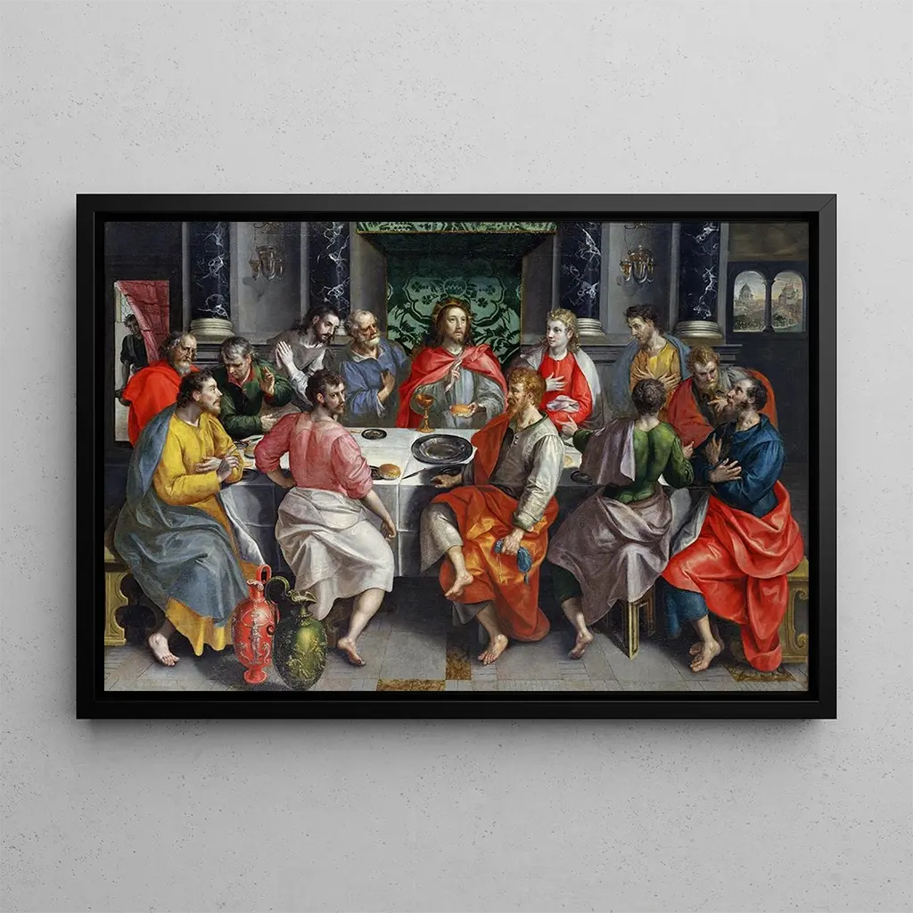 La reproduction de La Cène, œuvre emblématique de Maerten de Vos, nous plonge dans une atmosphère à la fois sacrée et intime. Les personnages, disposés autour d'une table richement ornée, semblent capturés dans un moment de révélation et de tension. Les couleurs chaudes et les jeux d'ombre accentuent le drame de la scène, tandis que la technique du clair-obscur donne une profondeur saisissante à l'ensemble. Chaque visage raconte une histoire, chaque geste est chargé de signification, invitant le spectateur à contempler ce moment crucial de la tradition chrétienne.