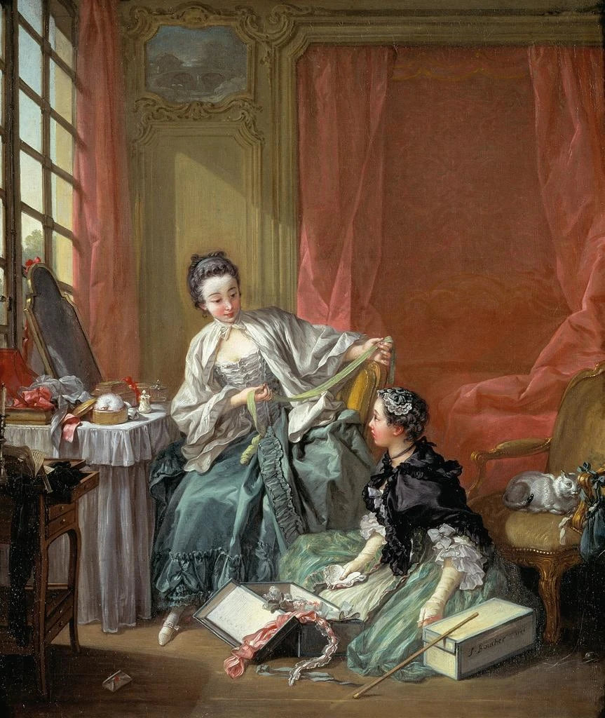 Dans l'univers enchanteur de l'art rococo, l'œuvre "La modiste" de François Boucher se distingue par son élégance et sa délicatesse. Peinte au XVIIIe siècle, cette toile évoque non seulement la mode de l'époque, mais aussi l'esprit même d'une société en pleine effervescence. L'artiste, à travers cette représentation, nous plonge dans un monde où la beauté et la frivolité s'entrelacent, offrant un aperçu fascinant de la vie quotidienne des femmes de son temps. La scène, à la fois intime et raffinée, capte l'attention et invite à une contemplation prolongée, révélant les subtilités des émotions humaines et des interactions sociales.