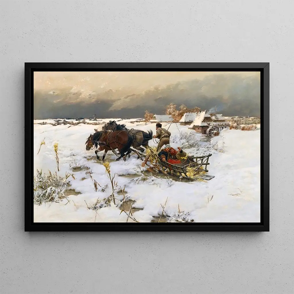 La reproduction de La promenade en traîneau de Jaroslav Věšín capture un moment de joie hivernale, où la neige immaculée enveloppe le paysage. Les traîneaux colorés, tirés par des chevaux, contrastent avec le blanc éclatant du sol, créant une scène vivante et dynamique. La technique de Věšín, mêlant réalisme et touches impressionnistes, donne vie à cette œuvre, où chaque détail, des flocons de neige aux visages souriants, contribue à l’atmosphère festive et chaleureuse de l’hiver.