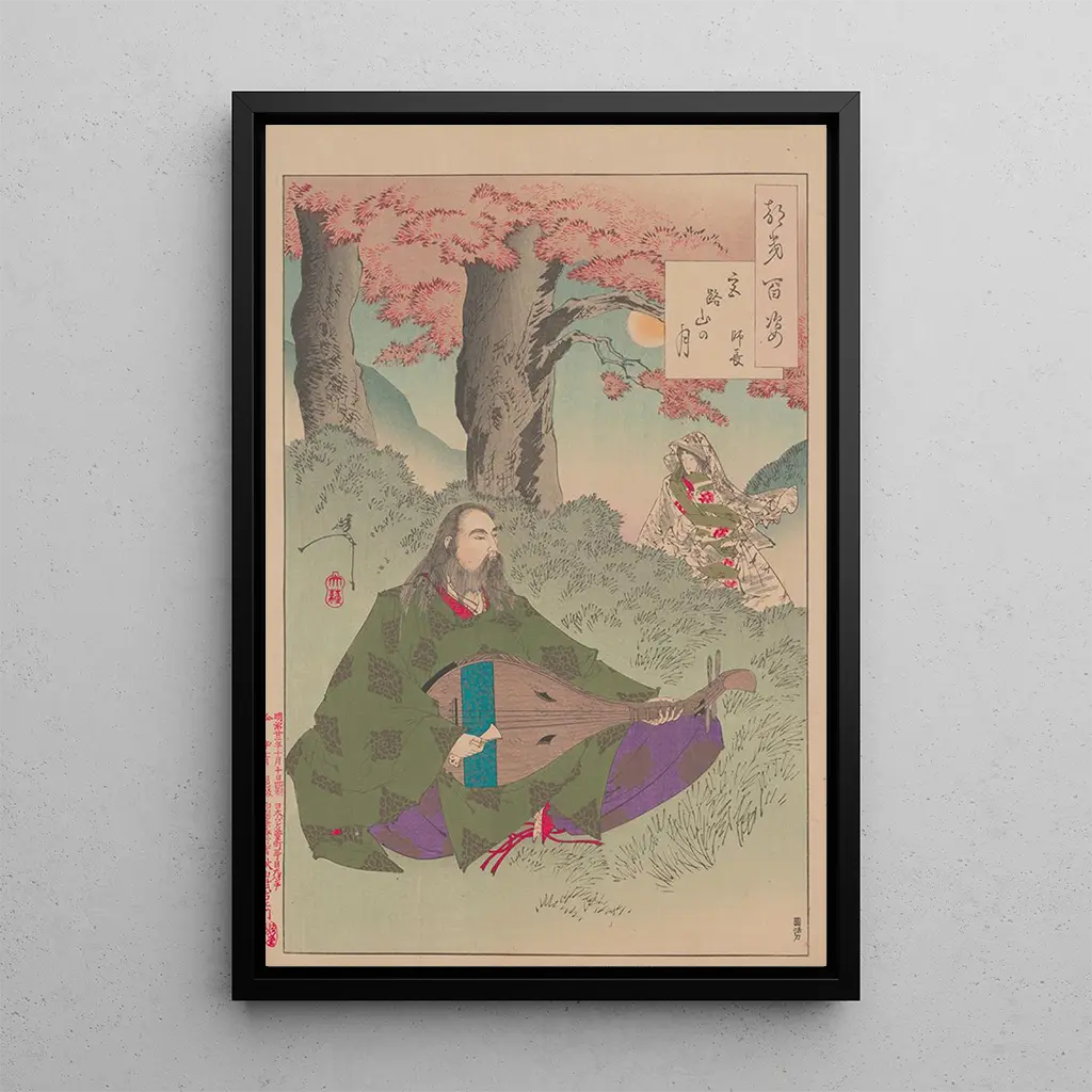 La reproduction de l'œuvre "Lune du mont Miyaji" de Tsukioka Yoshitoshi évoque une scène nocturne empreinte de sérénité. Les teintes douces de bleu et d'argent se mêlent pour créer une atmosphère mystique, où la lune éclaire délicatement le paysage. La composition est soigneusement équilibrée, avec des éléments naturels qui se fondent harmonieusement dans le décor. Les détails minutieux des arbres et des montagnes ajoutent une profondeur visuelle, invitant le spectateur à plonger dans cette vision poétique du Japon traditionnel. Chaque coup de pinceau semble capturer l'essence d'un moment fugace, suspendu entre rêve et réalité.
