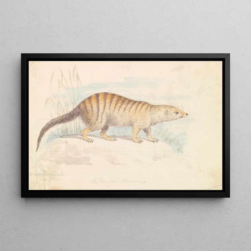 La reproduction de Charles Hamilton Smith, représentant la mangouste rayée, capte l'esprit vif et curieux de cet animal emblématique. Les teintes terreuses et les détails précis de la fourrure évoquent un habitat sauvage où la mangouste évolue avec agilité. L'œuvre, réalisée avec une technique d'illustration minutieuse, offre une atmosphère vivante et dynamique, invitant le spectateur à explorer le monde animalier. Chaque trait de pinceau semble raconter une histoire, révélant la beauté et la complexité de la vie sauvage.