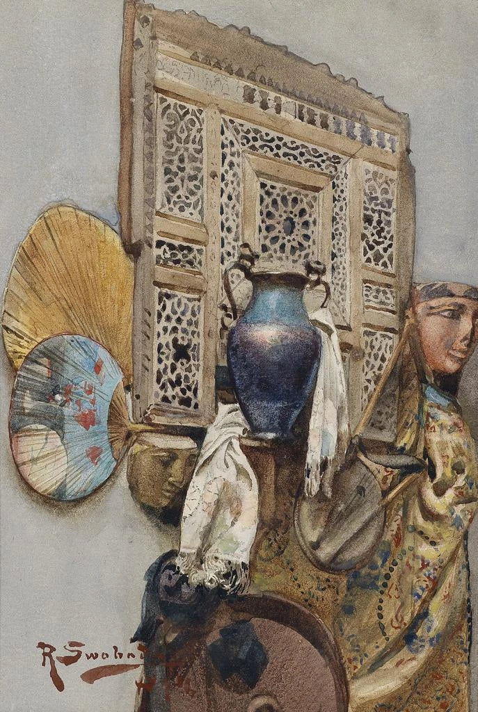 Rudolf Swoboda, actif à la fin du XIXe siècle, est un artiste dont le travail s'inscrit dans le courant du réalisme. Influencé par ses voyages en Orient, il a su intégrer des éléments culturels variés dans ses œuvres, témoignant d'une curiosité insatiable pour les traditions artistiques du monde. Sa capacité à capturer la lumière et la texture des objets lui a valu une reconnaissance dans le milieu artistique de son époque. Swoboda a su allier son héritage européen à des inspirations orientales, créant ainsi un style unique qui continue d'influencer les artistes contemporains.