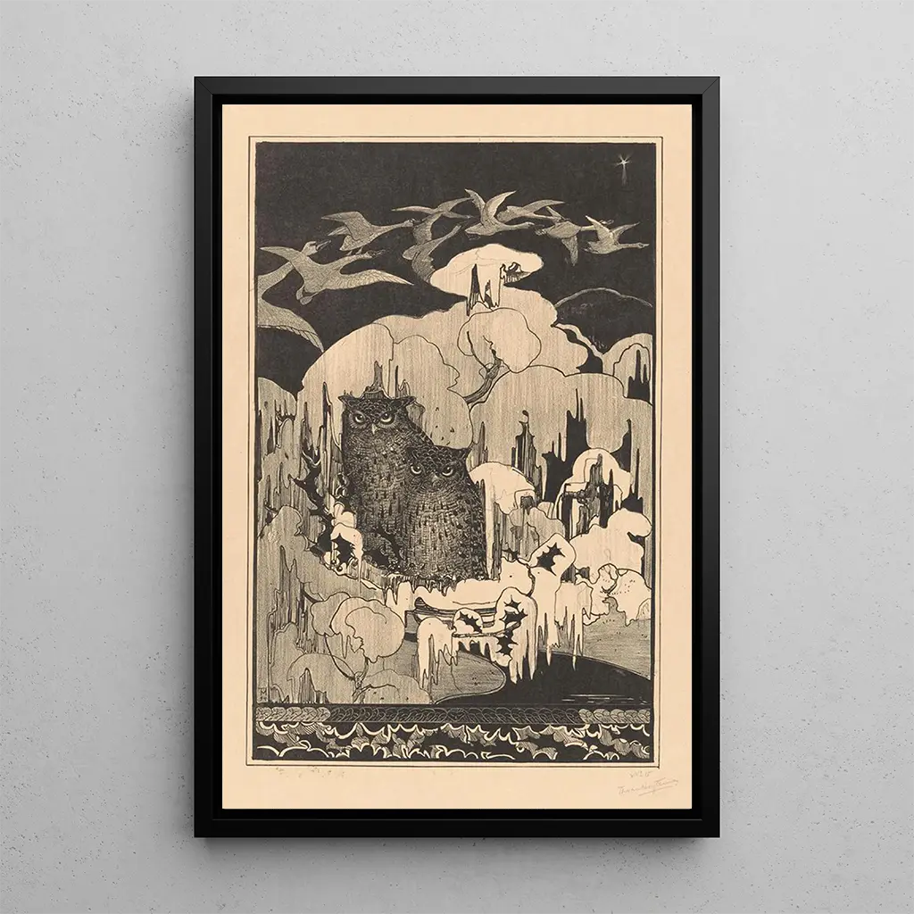 La reproduction de "Nuit de Noël" de Theo van Hoytema évoque une atmosphère paisible et féerique. Les teintes sombres du ciel étoilé se mêlent à des éclats de lumière douce, créant un contraste captivant. La technique de l’artiste, qui combine aquarelle et huile, donne vie à une scène où la nature et l’architecture s’entrelacent harmonieusement. Les silhouettes des arbres et des maisons, délicatement éclairées, invitent à la contemplation et à la rêverie, faisant de cette toile un véritable poème visuel sur la magie des nuits d’hiver.