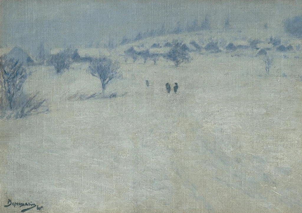 Le tableau "Paysage d'hiver" de Vasily Vereshchagin transporte le spectateur dans un monde silencieux et glacé. La composition, dominée par des teintes de blanc et de bleu, évoque la pureté et la sérénité d'un paysage enneigé. Les détails minutieux des arbres dénudés et des flocons de neige tombants créent une atmosphère presque éthérée. La technique de Vereshchagin, mêlant réalisme et impressionnisme, permet de ressentir la fraîcheur de l'air hivernal. Chaque coup de pinceau semble capturer l'essence même de l'hiver, invitant à une contemplation introspective et poétique.