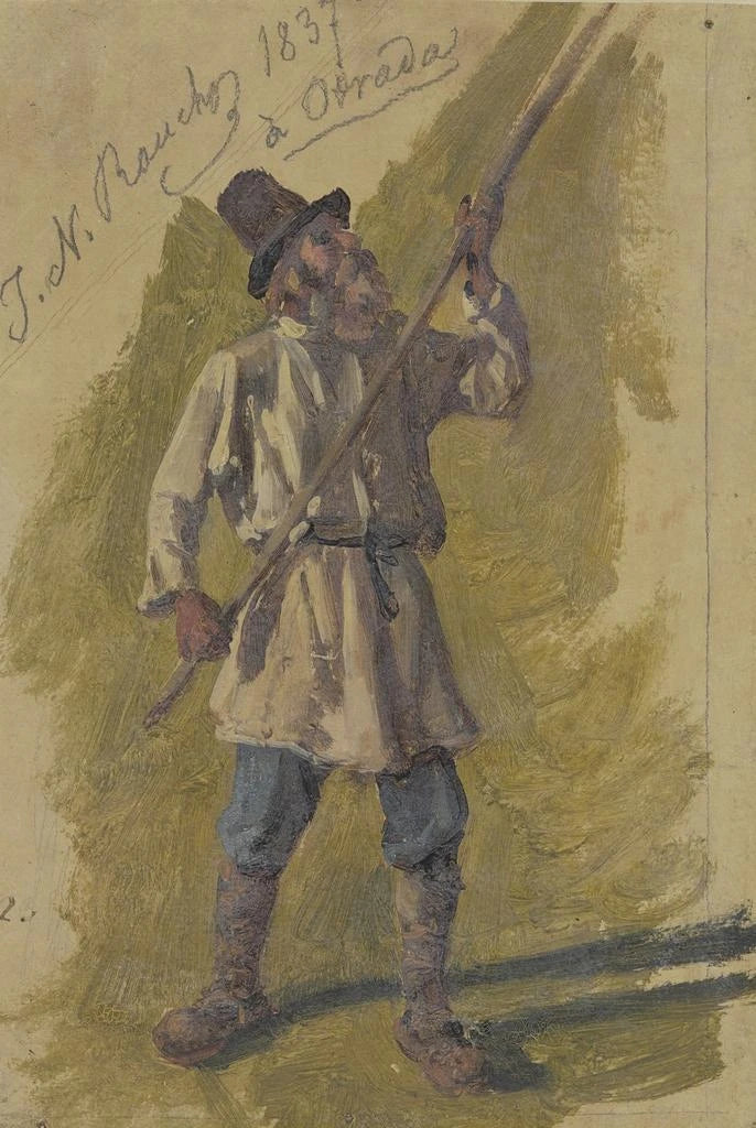Le tableau "Paysan russe au travail" illustre avec brio la vie quotidienne des agriculteurs dans un paysage rural. La scène dépeint un homme en pleine activité, sa posture dynamique et son expression concentrée témoignent de l'effort et de la détermination. Les couleurs terreuses, associées à des touches de vert et de bleu, évoquent la richesse des champs et la beauté de la nature environnante. La technique de Johann Nepomuk Rauch, qui mêle réalisme et sensibilité, permet de saisir l'authenticité de ce moment, rendant hommage à la vie laborieuse des paysans.