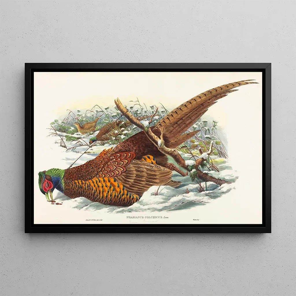 Phasianus colchicus : un éclat de couleurs dans la nature La reproduction de Phasianus colchicus, œuvre emblématique de John Gould, évoque la splendeur de la faune aviaire. Dans ce tableau, les couleurs vibrantes des plumes du faisan se mêlent harmonieusement à un arrière-plan délicat, créant une atmosphère à la fois vivante et sereine. Gould, maître de l'illustration ornithologique, utilise des techniques de gravure et d'aquarelle pour capturer chaque détail avec une précision remarquable. L'œuvre invite à une contemplation attentive, où chaque nuance de couleur et chaque trait de plume semblent prendre vie, transportant le spectateur dans un monde naturel riche et fascinant. John Gould : pionnier de l'ornithologie artistique John Gould, naturaliste et illustrateur britannique du XIXe siècle, a profondément marqué le domaine de l'ornithologie par ses œuvres. Né en 1804, il a consacré sa vie à l'étude des oiseaux, voyageant à travers le monde pour documenter la diversité aviaire. Ses illustrations, souvent considérées comme des chefs-d'œuvre, allient science et art, reflétant l'esthétique de son époque victorienne. Gould a collaboré avec de nombreux artistes et scientifiques, ce qui lui a permis de créer des œuvres qui sont à la fois informatives et visuellement captivantes. Son héritage perdure, et ses reproductions continuent d'inspirer les amateurs d'art et de nature. Une acquisition décorative aux multiples atouts La reproduction de Phasianus colchicus est une pièce décorative idéale pour tout espace, qu'il s'agisse d'un salon, d'un bureau ou d'une chambre. Sa qualité d'impression et sa fidélité aux détails originaux font de cette toile un choix attrayant pour les passionnés d'art et de nature. En ajoutant cette œuvre à votre décoration intérieure, vous apportez une touche d'élégance et de couleur, tout en célébrant la beauté de la faune. Ce tableau, avec son esthétique raffinée, saura captiver les regards et susciter des conversations, faisant de votre espace un lieu d'inspiration et de contemplation.