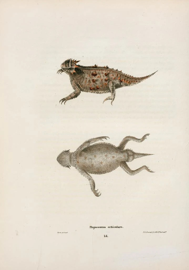 John Edwards Holbrook, naturaliste et artiste du XIXe siècle, a marqué son époque par ses contributions à l'illustration zoologique. Élevé dans un environnement où la nature était omniprésente, il a développé une passion pour les reptiles et les amphibiens. Holbrook a été influencé par les découvertes scientifiques de son temps, cherchant à allier art et science dans ses œuvres. Son travail a joué un rôle essentiel dans la documentation des espèces américaines, faisant de lui une figure incontournable dans le domaine de l'histoire naturelle. Ses illustrations, comme celle du Phrynosome orbiculaire, témoignent de son engagement à capturer la diversité de la vie animale.