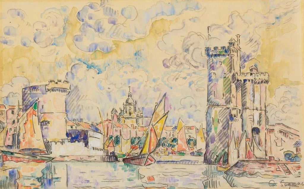 Le tableau "Port de La Rochelle" de Paul Signac capture l'effervescence d'un port animé, où les voiles blanches des bateaux se mêlent aux reflets scintillants de l'eau. Les couleurs vives et audacieuses, typiques du style pointilliste, insufflent une énergie dynamique à la scène. La technique de Signac, qui consiste à appliquer des touches de couleur juxtaposées, crée une atmosphère vibrante et lumineuse, invitant le spectateur à ressentir le mouvement et la vie qui émanent de ce lieu emblématique. Chaque détail, des quais aux bateaux, est une célébration de la vie maritime.