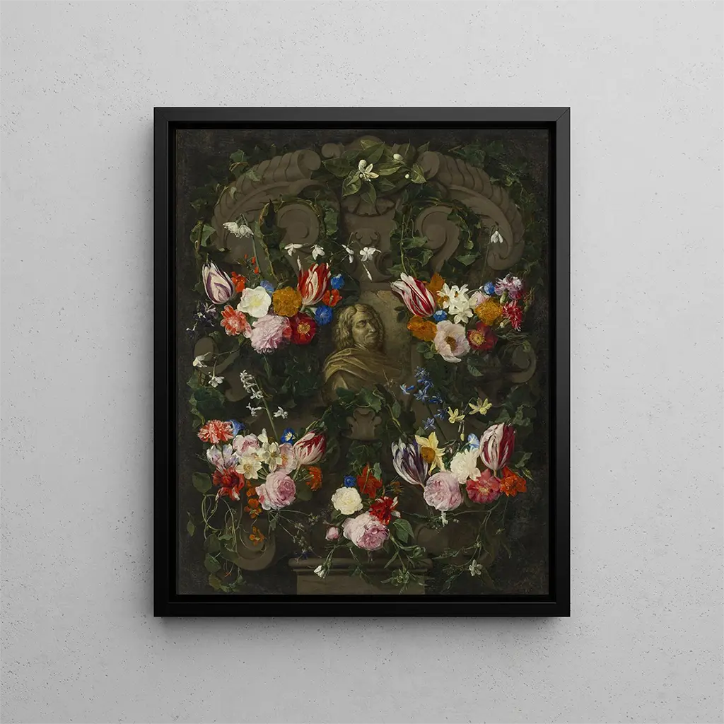 Le style de Daniel Seghers, qui se manifeste dans ce portrait, se caractérise par une maîtrise exceptionnelle de la lumière et de la couleur. Chaque coup de pinceau semble être une ode à la beauté, où les détails des drapés et des textures sont rendus avec une précision remarquable. La composition est soigneusement orchestrée, mettant en avant le visage de Poussin, dont l'expression réfléchie suggère une profondeur intellectuelle et une passion pour l'art. L'arrière-plan, subtilement flou, permet au regard de se concentrer sur le sujet principal tout en ajoutant une dimension de mystère. Ce portrait ne se contente pas de représenter un homme ; il incarne une époque où l'art était à la fois un reflet de la réalité et une fenêtre sur l'imaginaire.