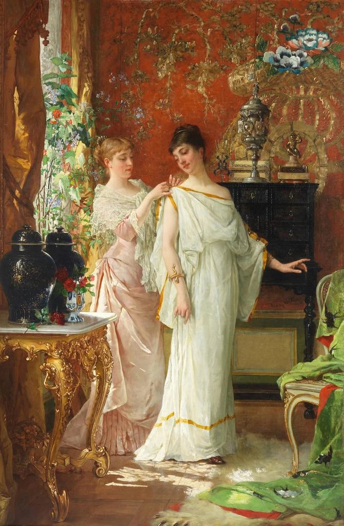 Dans "Préparatifs", Jan Verhas nous plonge dans une atmosphère intimiste où la lumière douce caresse les visages des personnages. La composition, centrée sur une femme en train de préparer une activité, évoque une tranquillité et une harmonie qui invitent à la contemplation. Les couleurs pastel, dominées par des teintes chaudes, créent un sentiment de chaleur et de confort. La technique de Verhas, qui mêle réalisme et touches impressionnistes, donne vie à chaque détail, des drapés des vêtements aux expressions délicates des visages. Cette œuvre est une véritable ode à la vie quotidienne, capturant un moment fugace avec une grande sensibilité.