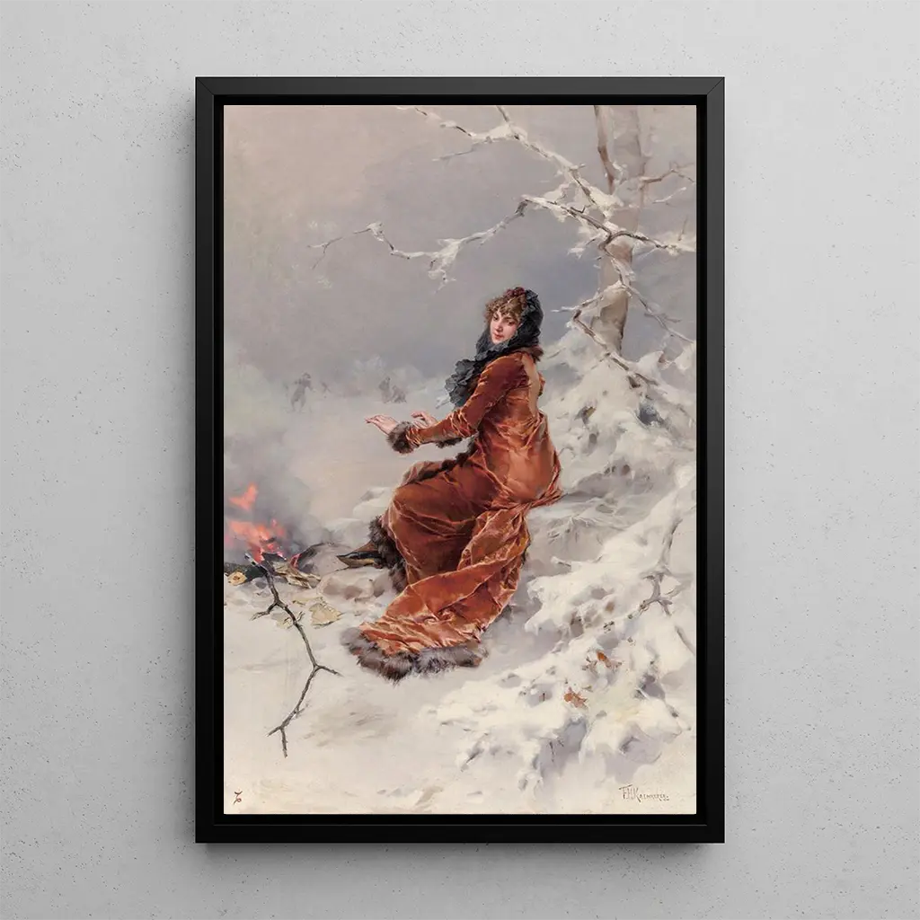 La reproduction de Près de l'Étang de Patinage évoque une scène paisible d'hiver, où la glace lisse de l'étang devient le théâtre de joyeuses activités. Les nuances de bleu et de blanc, associées à des touches de couleurs chaudes, créent une atmosphère à la fois calme et festive. Les personnages, habillés de vêtements d'époque, glissent et s'amusent, tandis que les arbres dénudés encadrent ce tableau enchanteur. Cette œuvre transporte le spectateur dans un moment de convivialité, où la nature et l'humanité se rencontrent harmonieusement.