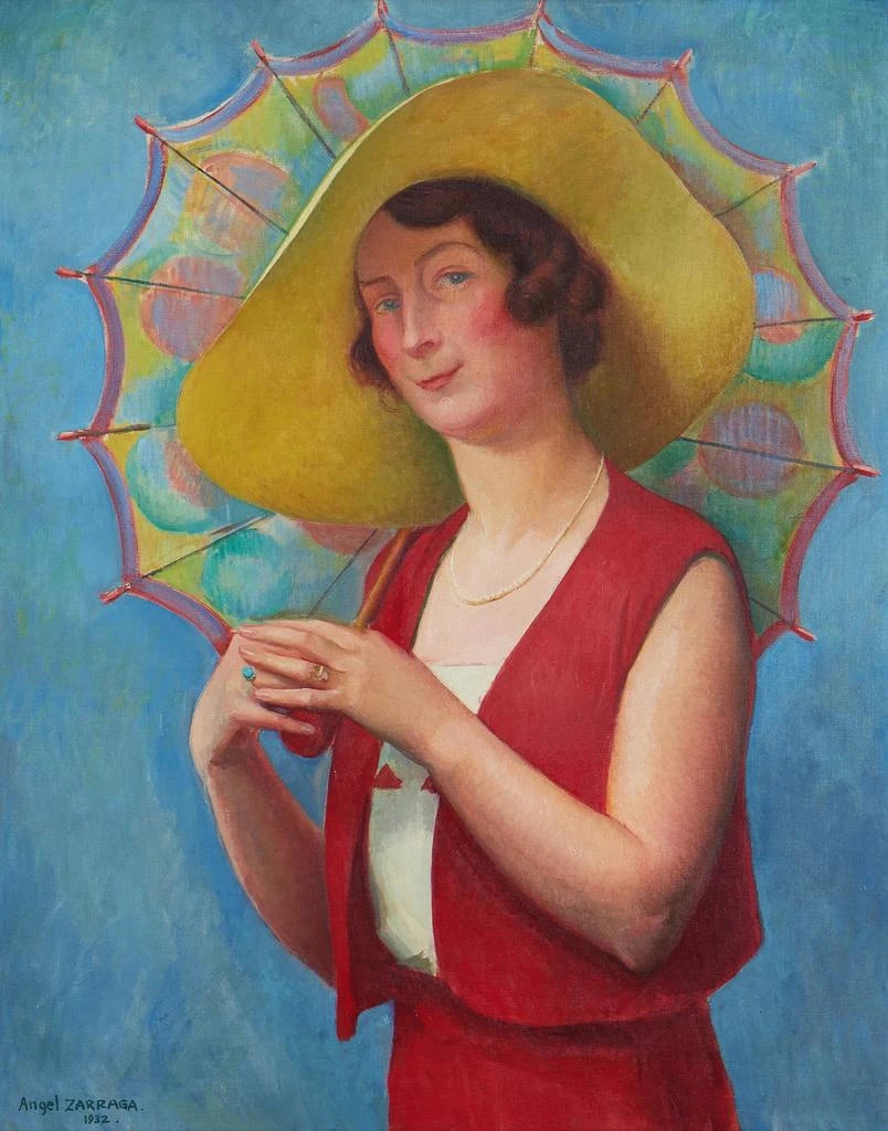 Zárraga s’attache à peindre des figures empreintes de sérénité et de force intérieure. Dans Jeune femme à l’ombrelle, il mêle le charme du portrait classique à une sensibilité moderniste, rendant hommage à la beauté silencieuse et intemporelle du féminin.