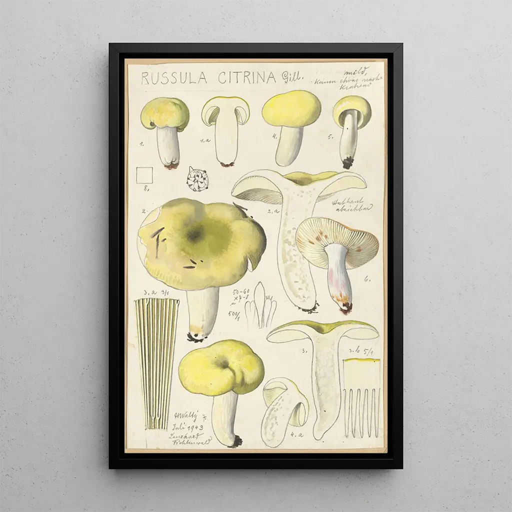 La reproduction de Russula citrina, œuvre de Hans Baldung, dévoile une composition fascinante où les nuances de jaune et de vert s'entrelacent avec une délicatesse remarquable. Les formes organiques des champignons, magnifiquement rendues, semblent presque vibrer sous la lumière. La technique de Baldung, mêlant le réalisme à une touche d'imaginaire, crée une atmosphère à la fois sereine et mystérieuse. Chaque détail, des contours des champignons aux reflets de lumière, invite le spectateur à plonger dans un monde naturel empreint de poésie.