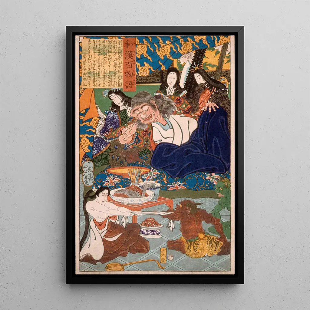 Dans cette reproduction de Shutendji entouré de femmes, l'artiste Tsukioka Yoshitoshi nous plonge dans un univers riche en couleurs et en émotions. La composition dynamique met en avant le personnage central, Shutendji, un démon légendaire, entouré de femmes qui semblent à la fois fascinées et craintives. Les teintes vives et les détails minutieux des vêtements traditionnels japonaises ajoutent une profondeur à la scène, tandis que les expressions des personnages transmettent une atmosphère de mystère et de tension. La technique de gravure sur bois, caractéristique de l'ukiyo-e, permet à Yoshitoshi de jouer avec la lumière et l'ombre, créant ainsi un effet visuel saisissant.