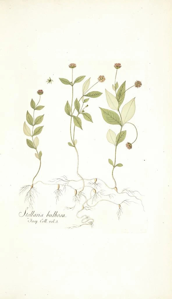 Nikolaus Joseph Freiherr von Jacquin est une figure emblématique du XVIIIe siècle, alliant science et art dans ses représentations botaniques. Botaniste de renom, il a consacré sa vie à l'étude des plantes, influencé par les découvertes de son temps. Ses voyages à travers l'Europe et les Antilles lui ont permis de collecter des spécimens rares, qu'il a illustrés avec une précision remarquable. La reproduction de Stellaria bulbosa témoigne de son habileté à capturer la beauté de la nature tout en respectant les principes scientifiques. Son héritage perdure à travers ses œuvres, qui continuent d'inspirer les amateurs de botanique et d'art.